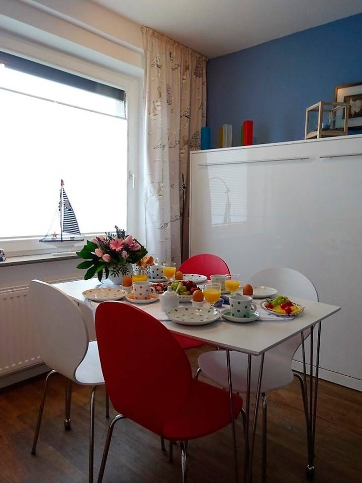 Das geräumige, lichtdurchflutete Wohnzimmer im maritimen Stil / Südlage verfügt über: Flachbild/Kabel-TV, DVD-Player, Radio-CD-USB-Stereoanlage, WLAN. Kombiniertes Esszimmer für 4 Personen mit Schrankbett 140/200 für 1-2 Personen, antikes Küchenbüffet für Gläser, Bestecke, Essgeschirr. Das Schlafzimmer ist mit Schwebetürschrank (150 cm breit) in Hochglanzoptik und Doppelbett 180/200 (2 Einzelmatratzen 90x200) ausgestattet. Kleine Einbauküche mit Herd/Backofen/Ceranfeld, Geschirrspüler, Mikrowelle, Wasserkocher, Toaster, Kaffeemaschine. Das helle und freundliche Bad mit Dusche/WC, Waschbecken mit Unterschrank (anthrazit-hochglänzend) und Spiegelschrank; Handtuchheizkörper. Die