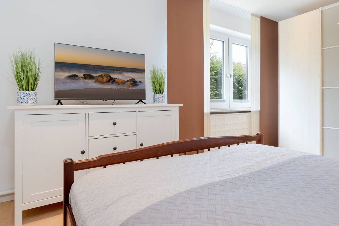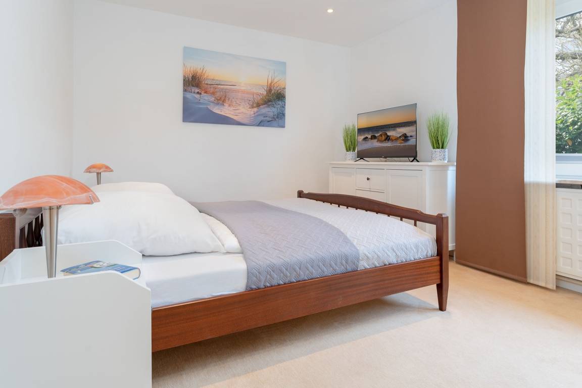 Schlafzimmer 1: 1 Doppelbett (180x200 cm), Kleiderschrank, TV, Verdunkelung: Plissee, Platz für Babybett vorhanden
