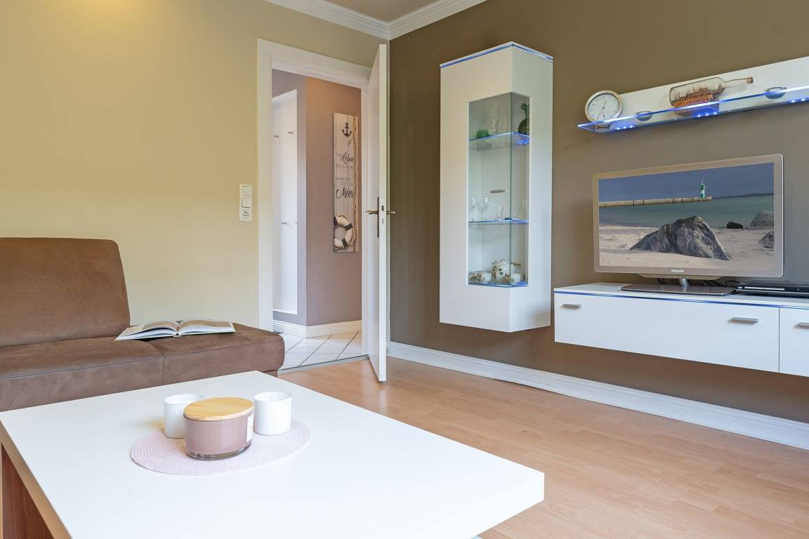 Hereinspaziert! Der helle Wohnbereich empfängt Sie mit einer kuscheligen Sofalandschaft, auf der jeder seinen Lieblingsplatz findet. TV und DVD-Player sorgen abends für die richtige Unterhaltung. Tagsüber können Sie Ihre Auszeit auf der Terrasse oder im 300 m² großen Garten genießen. Hier haben Sie mehrere Sitzgelegenheiten - und es darf auch gern gegrillt werden. Leckere Beilagen können Sie in der separaten Küche mit kleinem Essplatz zubereiten. Viele Extras machen die Selbstversorgung einfach. Prima träumen werden Sie in den beiden Schlafzimmern: Eins ist mit einem Doppelbett (180x200 cm) sowie TV ausgestattet, in dem anderen steht ein Etagenbett (2 x 90x200 cm). Das tageslichthelle Duschbad bringt Sie gut in den neuen Tag. Wie wäre es mit einem Ausflug zum rund 350 Meter entfernten Strand? Ein Bollerwagen steht für Sie bereit ...
