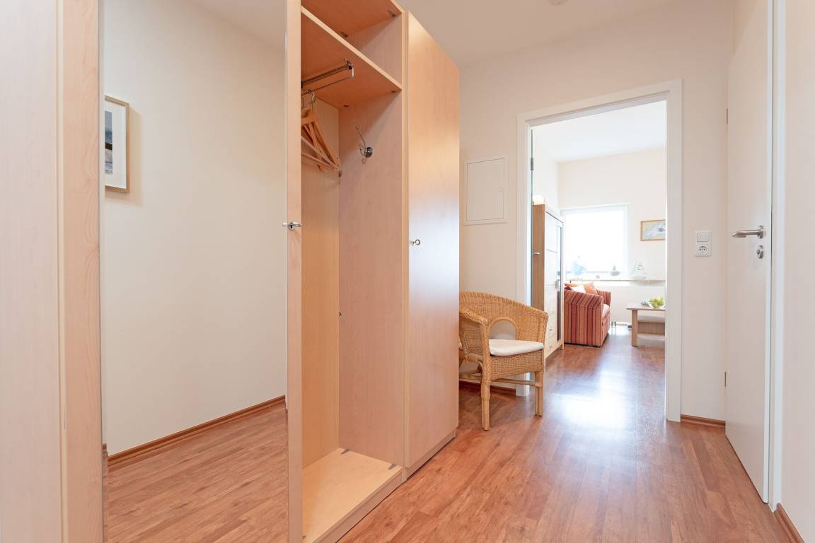 Das Herzstück der Wohnung ist der lichtdurchflutete Wohn- und Essbereich mit bequemer Couchgarnitur inkl. Schlafmöglichkeit (140x190 cm), Flachbildfernseher, Stereoanlage mit CD-Player, integriertem Essplatz, einer Küchenzeile mit Ceranfeld, Backofen, Kühlschrank mit Gefrierfach, Spülmaschine sowie diversem Zubehör. Von hier aus geht es direkt auf den möblierten Balkon mit atemberaubendem Blick über den gesamten Grömitzer Yachthafen. Das separate Schlafzimmer verfügt über ein komfortables Doppelbett (180x200 cm) sowie einen Kleiderschrank mit reichlich Stauraum für Ihre Urlaubsgarderobe. Auch im Flur ist weiterer Stauraum vorhanden. Im modernen Duschbad sorgen Annehmlichkeiten wie eine Fußbodenheizung und eine praktischer Handtuchheizung für Komfort und Wohlgefühl.