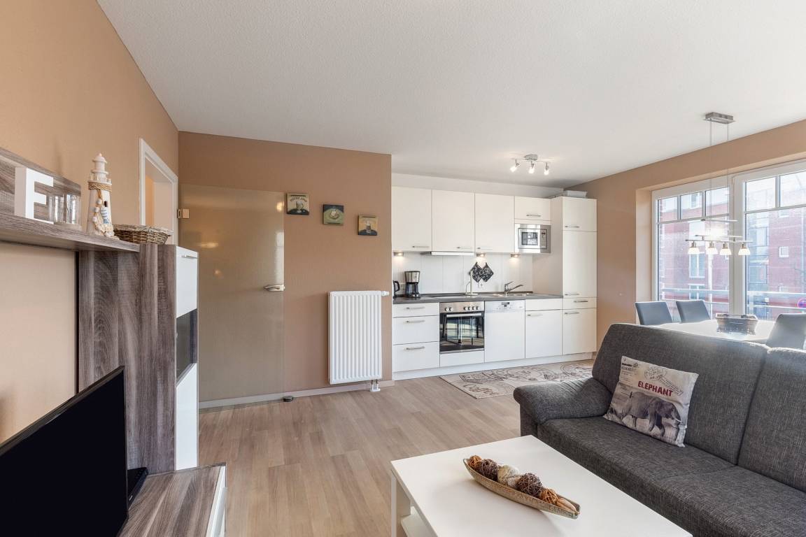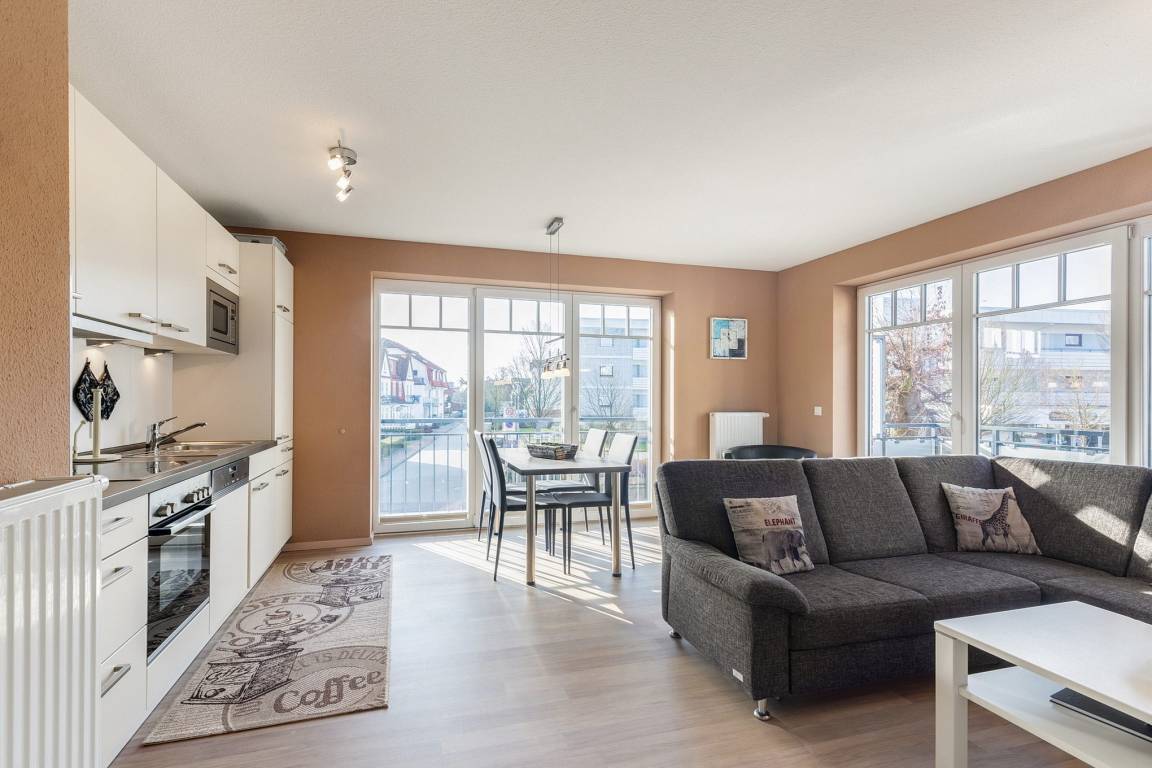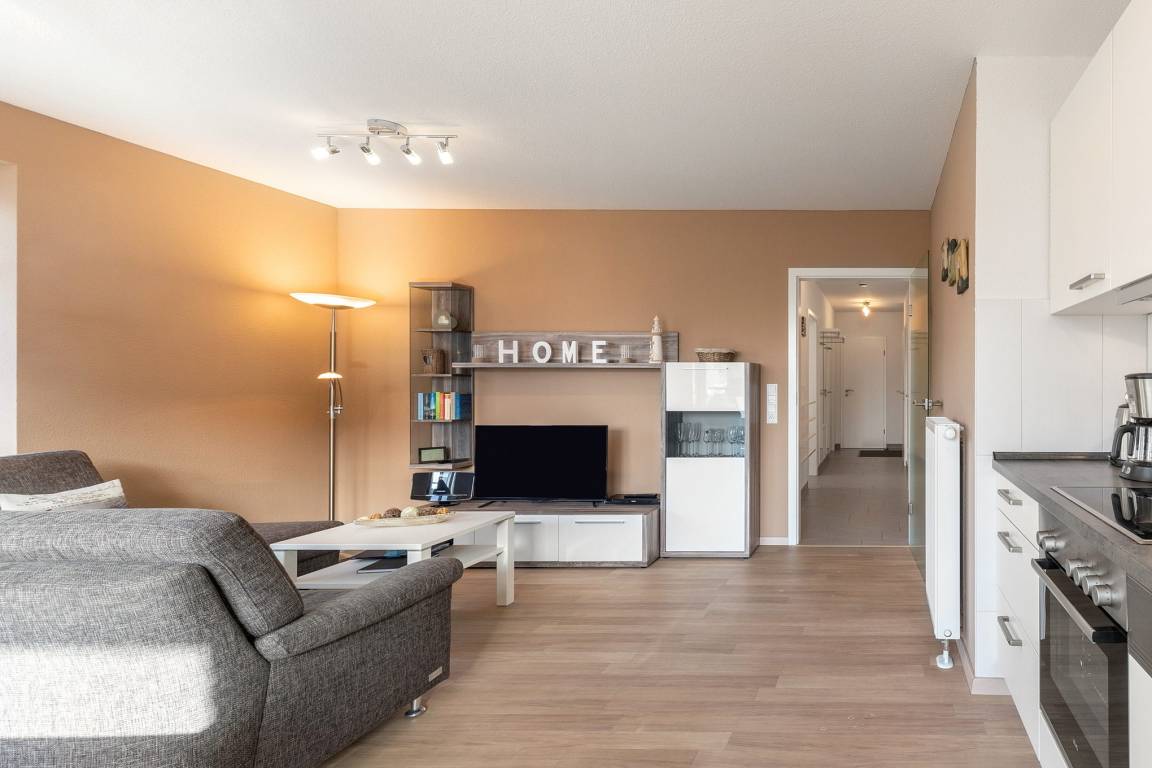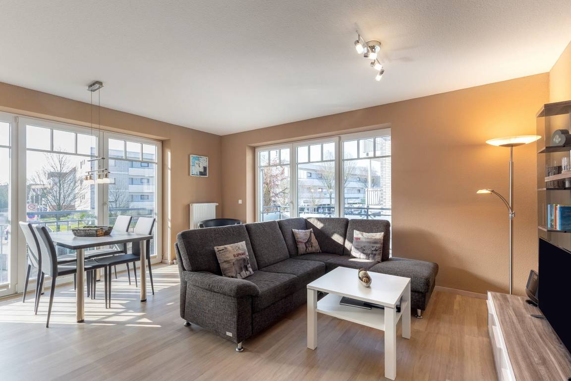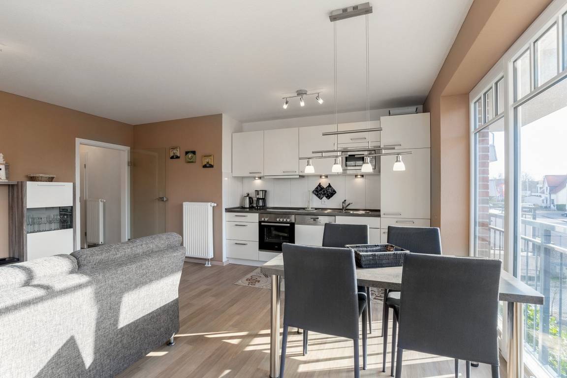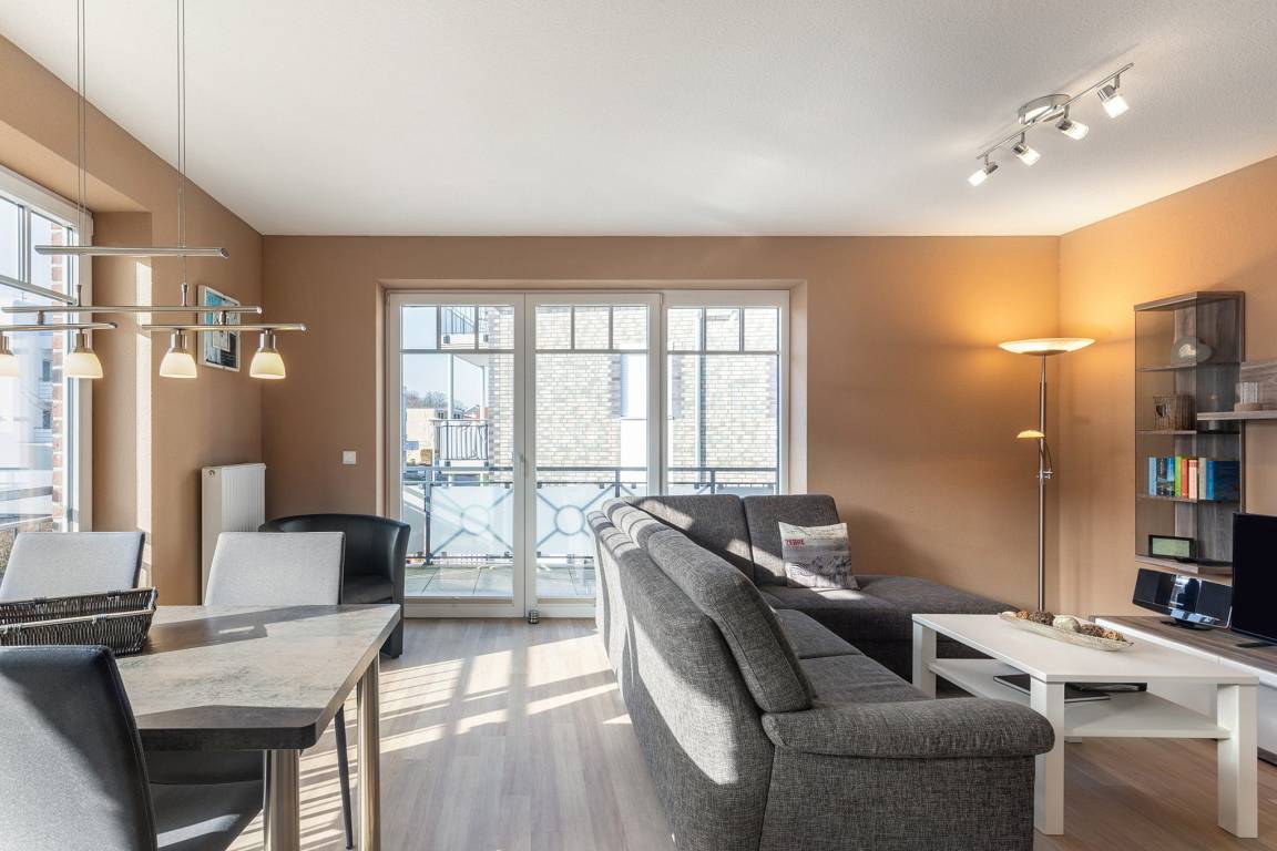 Modernes, helles Wohn- und Esszimmer mit direktem Zugang zum Balkon in westliche Richtung. Das Wohn- und Esszimmer ist mit einem Essplatz für 4 Personen, einer Eckcouch und einem Couchtisch ausgestattet. Zur Unterhaltung stehen ein Flachbildschirm, ein DVD-Player und eine Mini-Stereoanlage zur Verfügung.