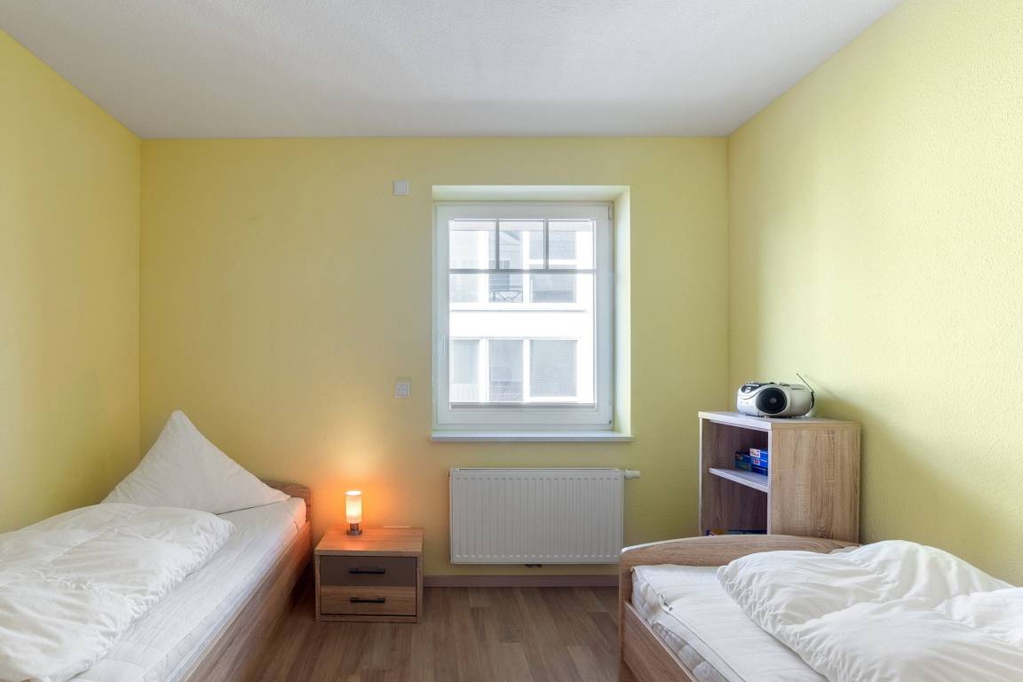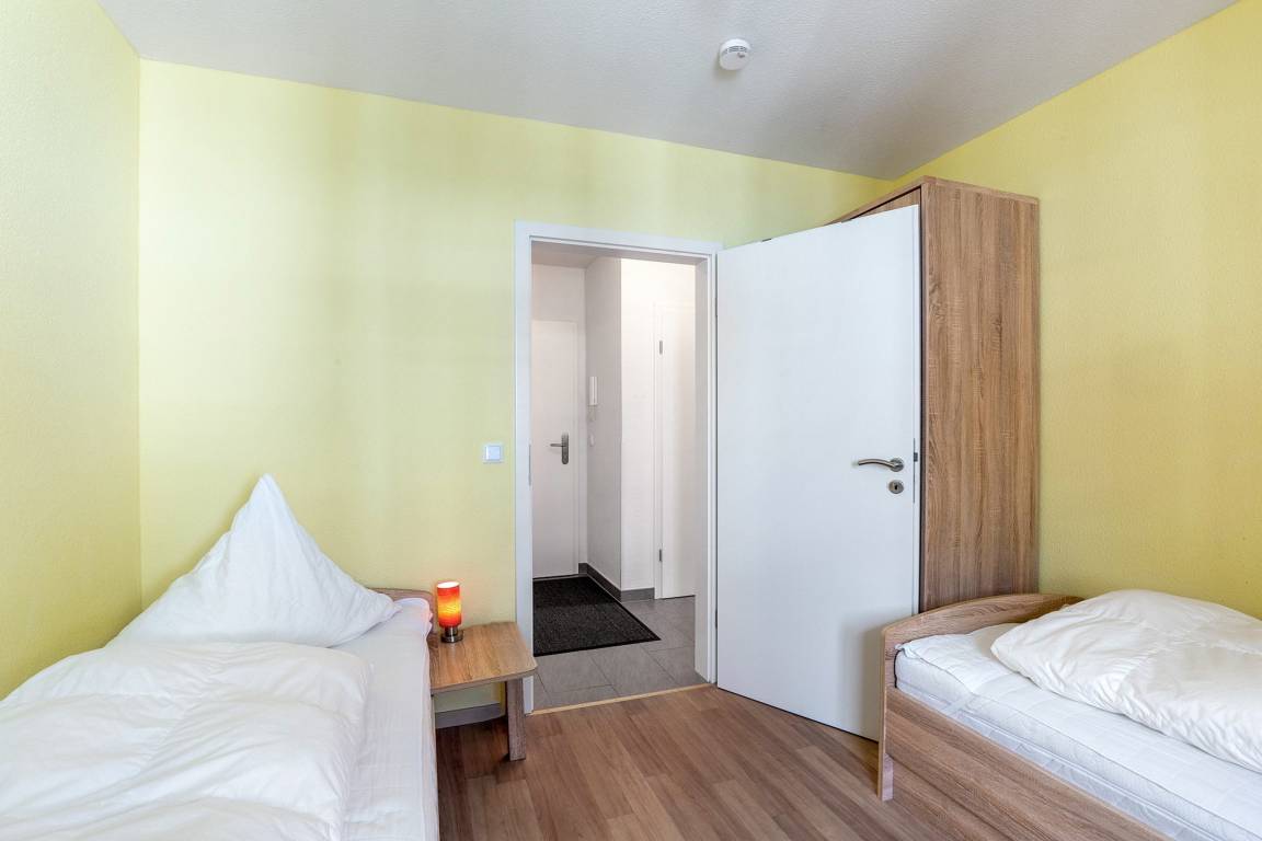 Separates, modern ausgestattetes Zimmer mit 2 Einzelbetten (90x200cm) und einem Kleiderschrank. Das Fenster lässt sich durch einen Außenrollladen vollständig verdunkeln.