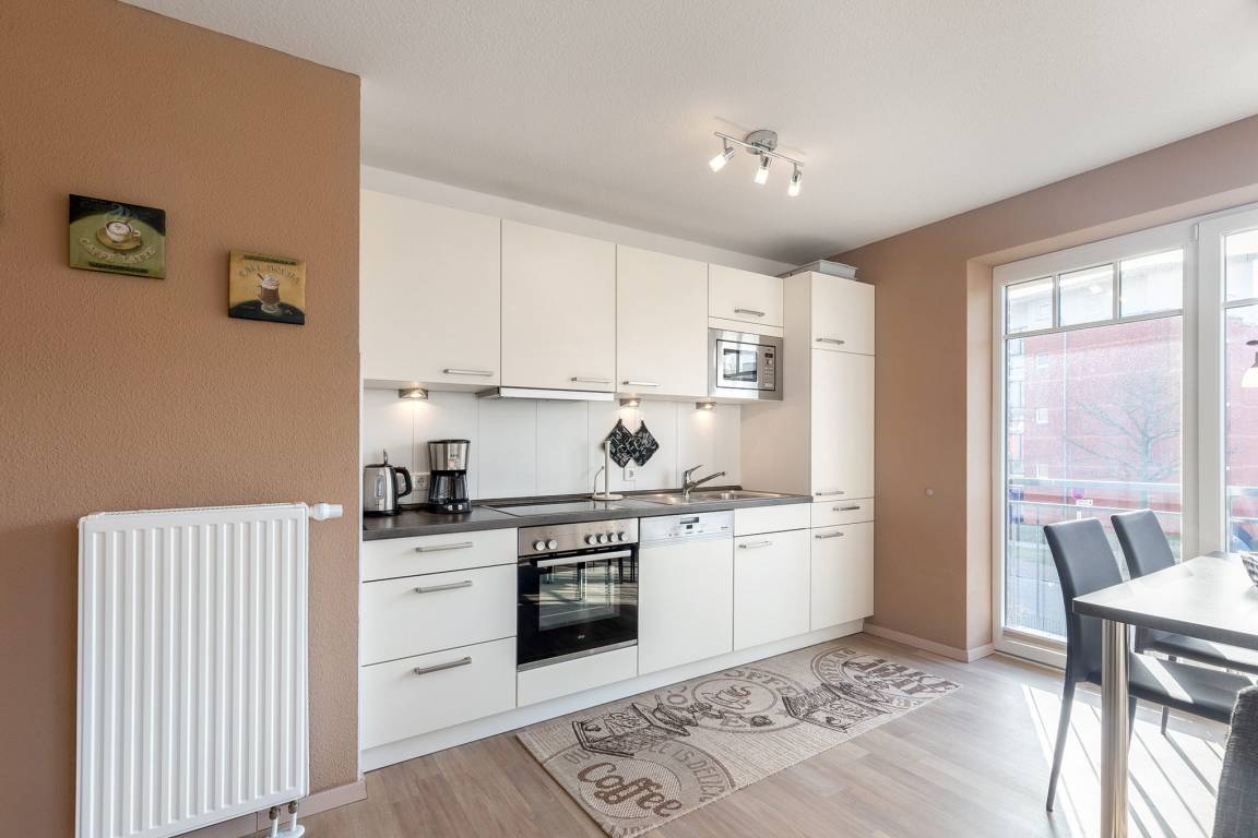 Moderne, zum Wohn- und Esszimmer offene, komplett ausgestattete Küche mit 4-Platten Cerankochfeld, Backofen, Spülmaschine, Kühlschrank mit kleinem 3-Sterne Gefrierfach, Mikrowelle, Kaffeemaschine und Mixer.