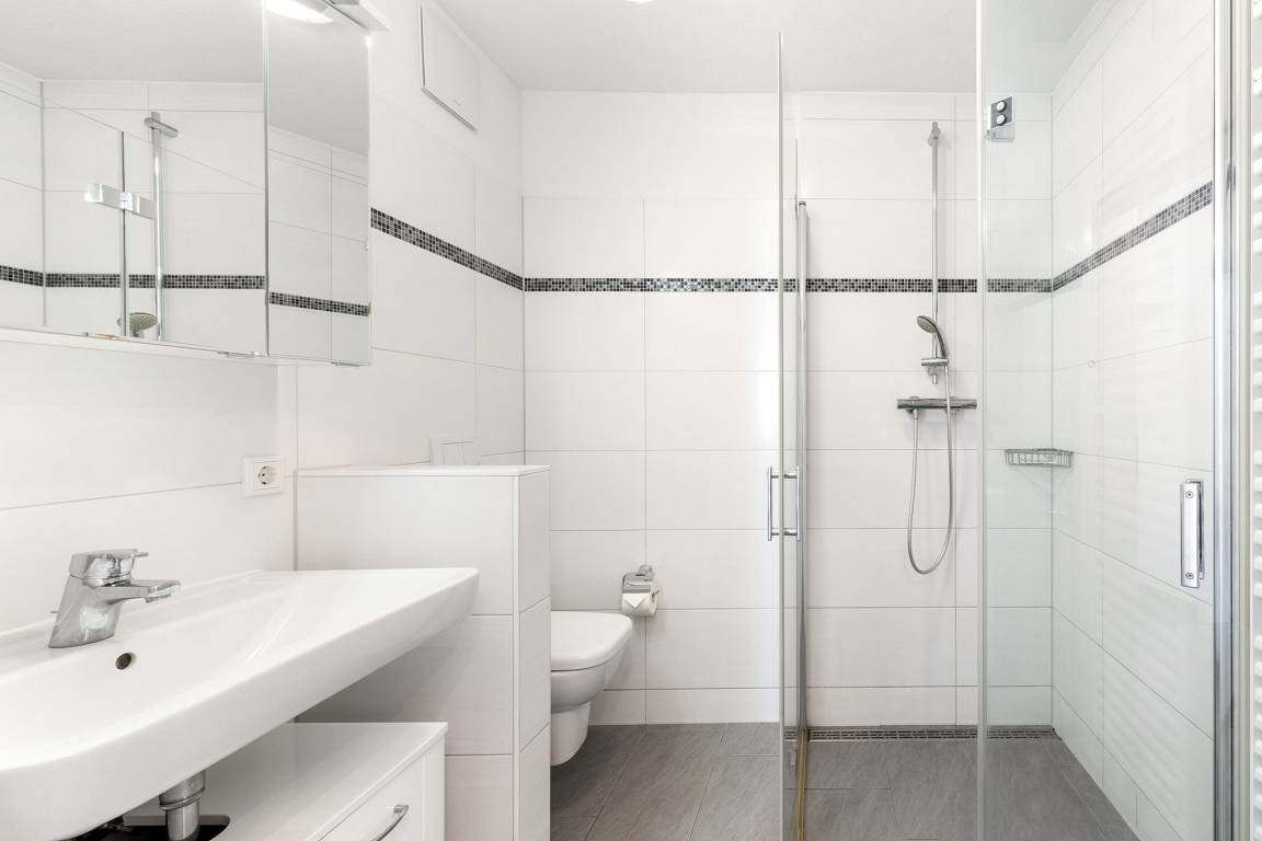 Modernes, gefliestes Bad mit Dusche, WC und Waschbecken. Im Bad und im separaten WC Fußbodenheizung.