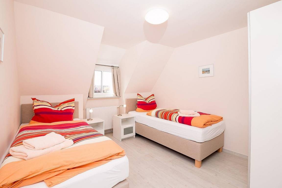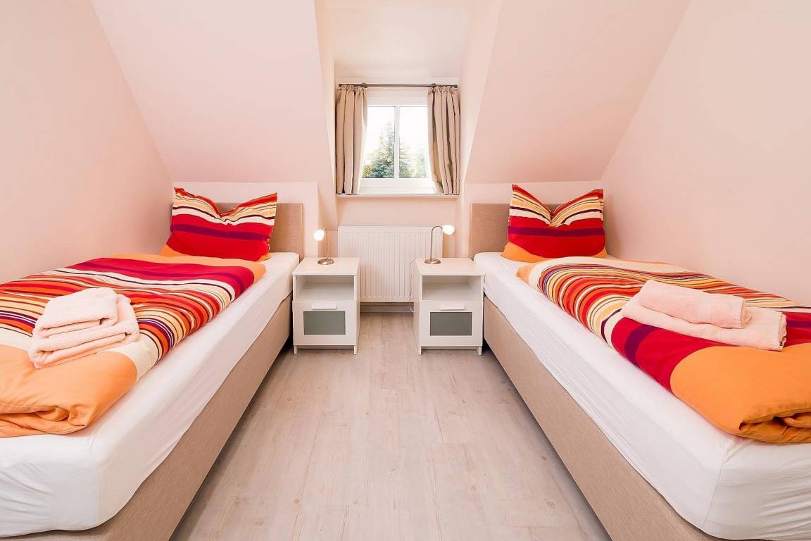 Die Schlafräume liegen im Obergeschoss. Ein Balkon gehört zum ersten Schlafzimmer, welches mit Boxspringbett (2 x 90 x 200 cm) und Kleiderschrank eingerichtet ist. Das zweite Zimmer hat zwei Betten je 90 x 200 cm und Kleiderschrank.