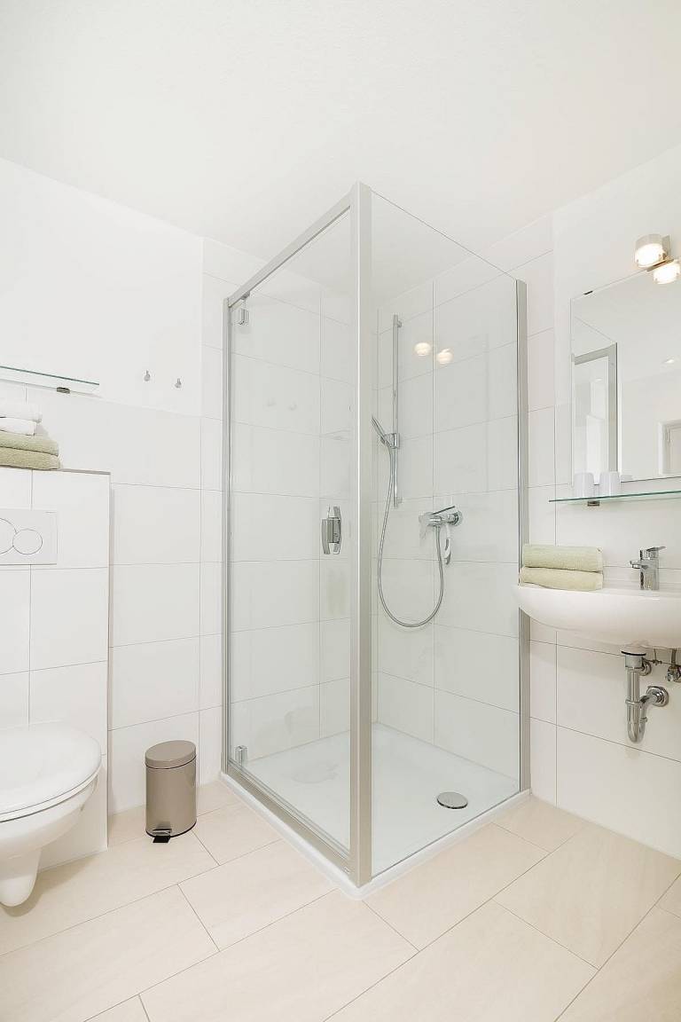 Vom Flur aus gehen Sie ins Badezimmer mit Dusche und WC. Im kleinen Abstellraum finden Sie Besen, Staubsauger und Zubehör.