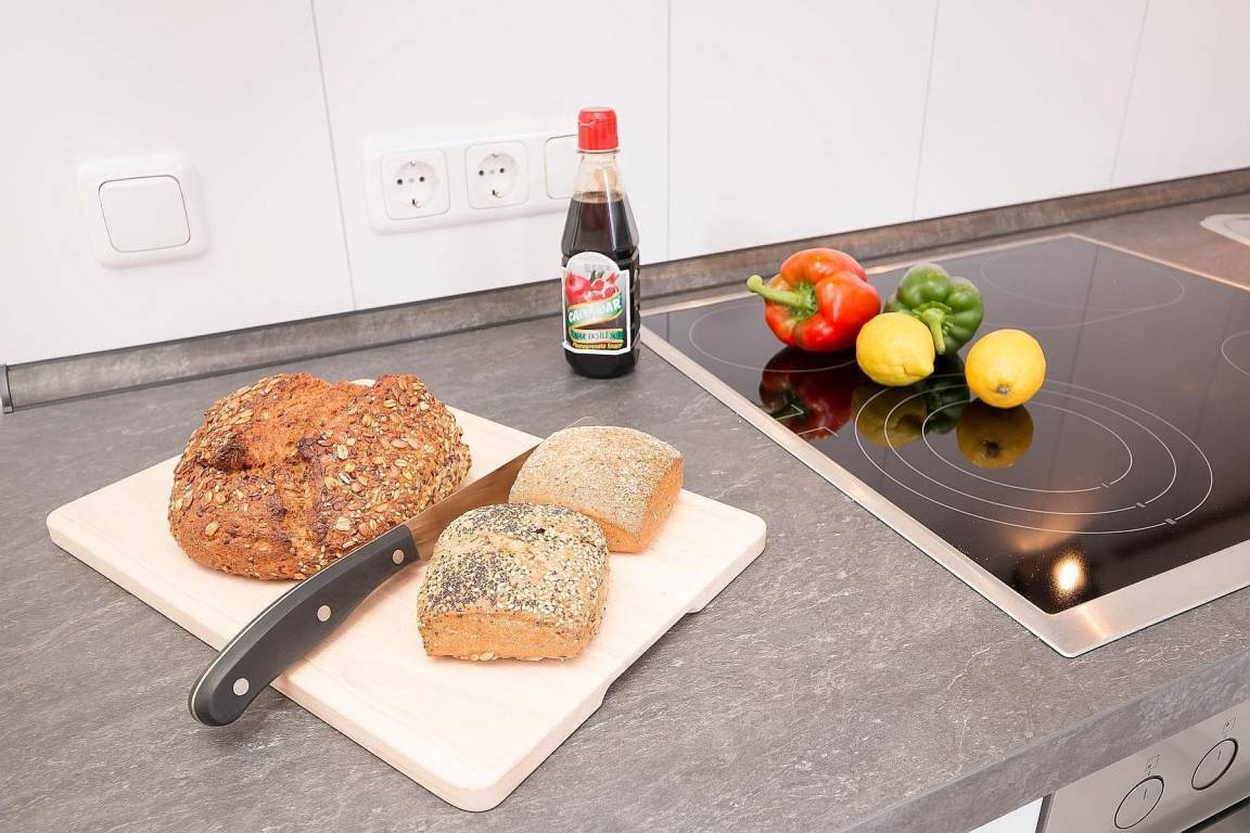 Die offene Komfort-Küche passt sich harmonisch in den großzügigen Wohnbereich ein. Esstisch und Stühle ergänzen optisch ansprechend den Raum.