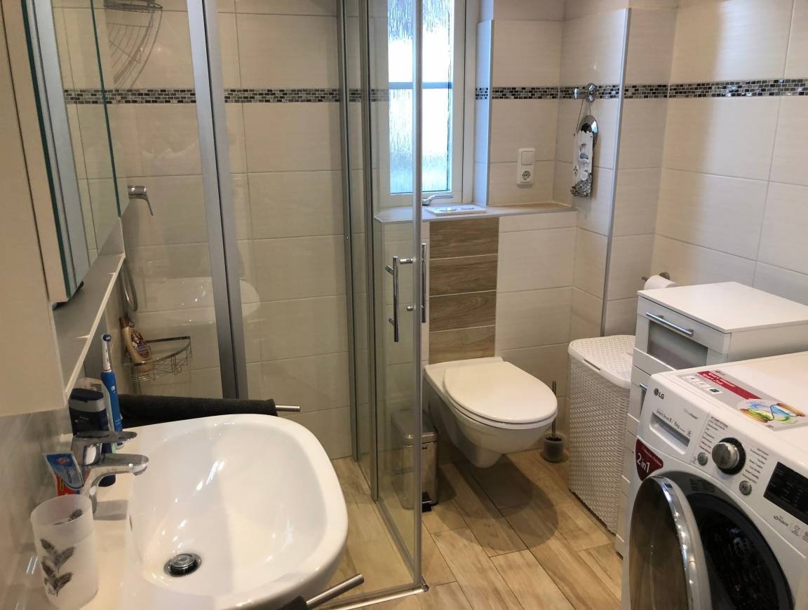 Modernes, freundliches Tageslichtbad mit Dusche, WC, Waschbecken, Haartrockner. Natürlich bieten wir Ihnen auch einen Waschtrockner zur Benutzung an.