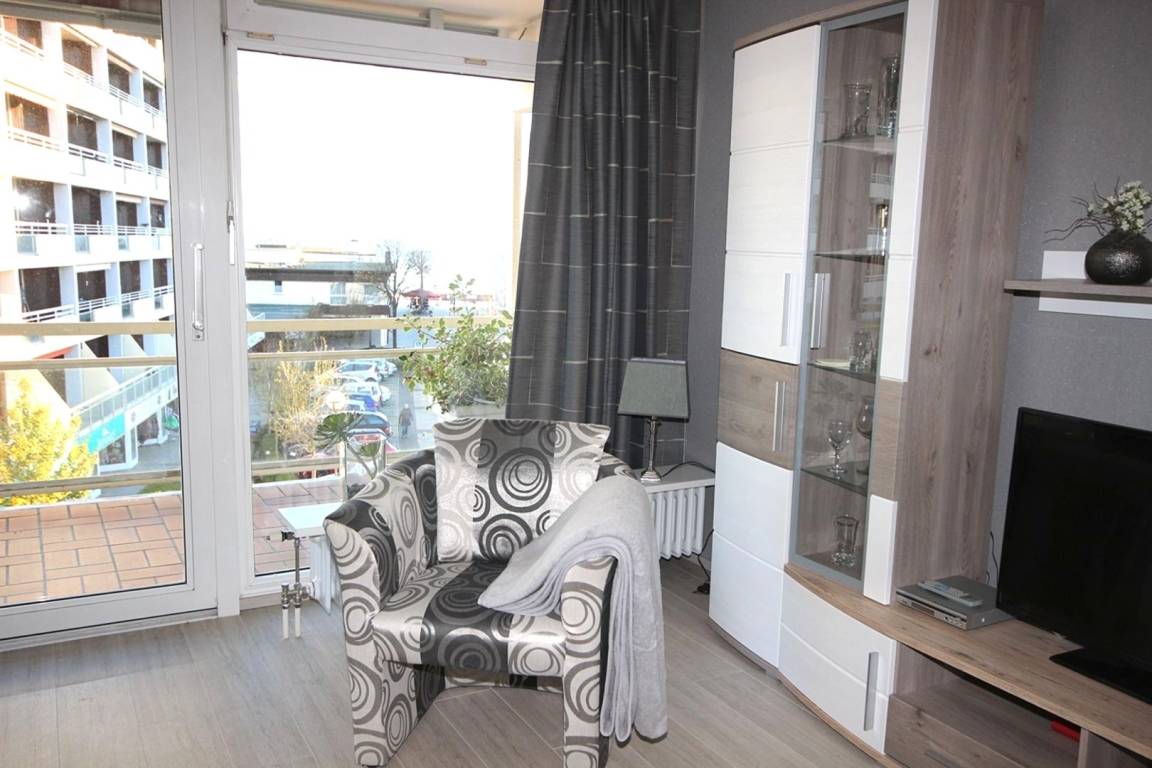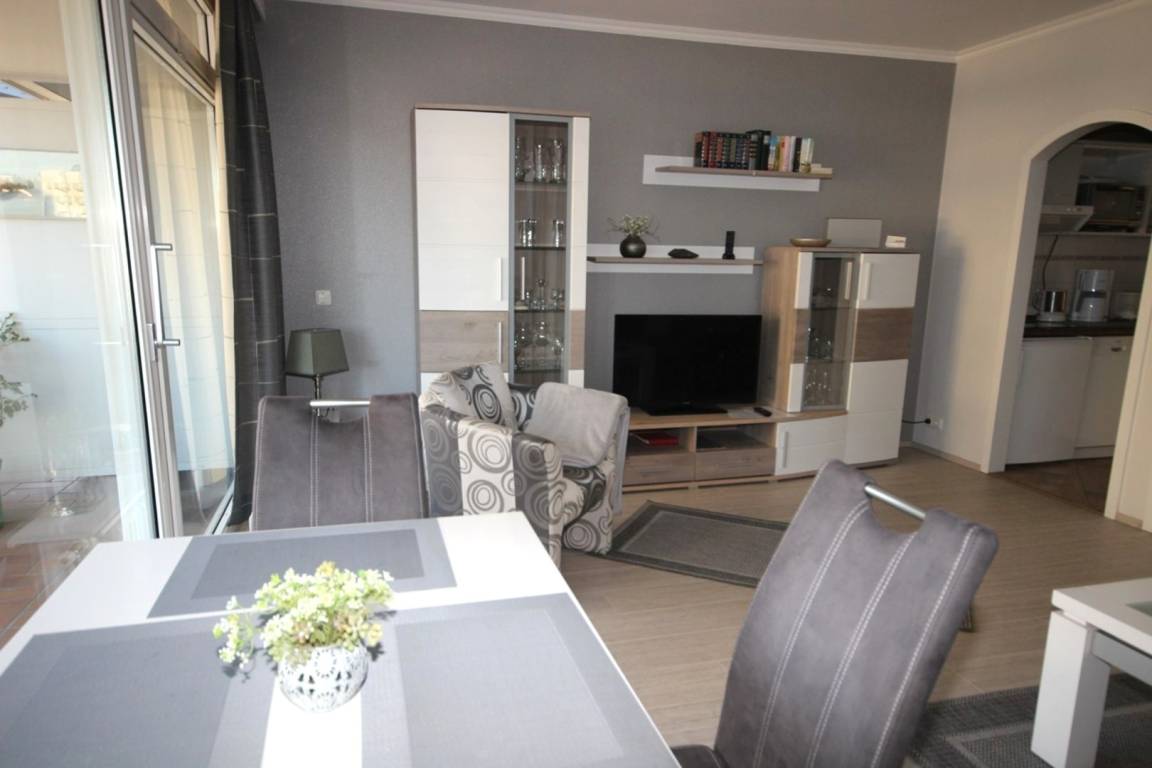 Der gemütliche Wohnbereich hat einen Essplatz und eine stilvolle Couchgarnitur, die zum Bett für 2 Pers. umfunktioniert werden kann, TV, DVD, CD-Radio große, möblierte Loggia mit Markise und Ostseeblick. (ca.50 m²)