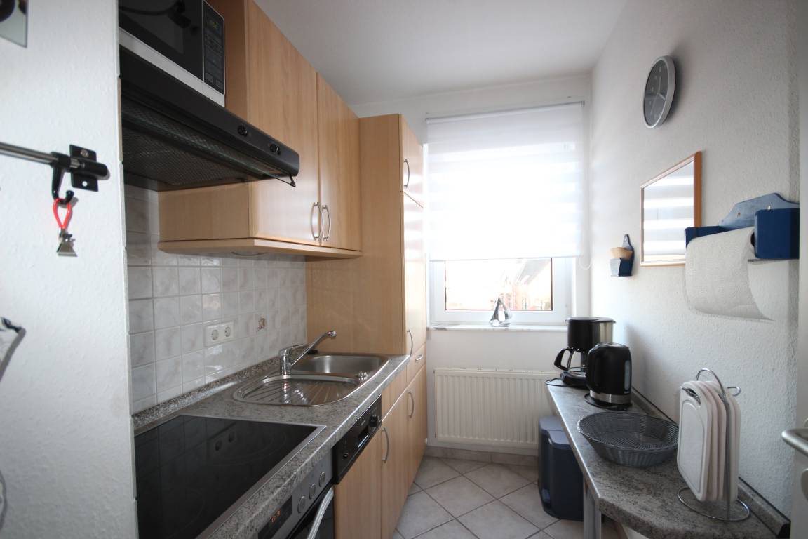 Die separate, offene Küche ist mit Backofen, 4-Platten Kochfeld, Geschirrspüler, Mikrowelle, Kühlschrank und allen üblichen Küchengeräten sehr gut ausgestattet.