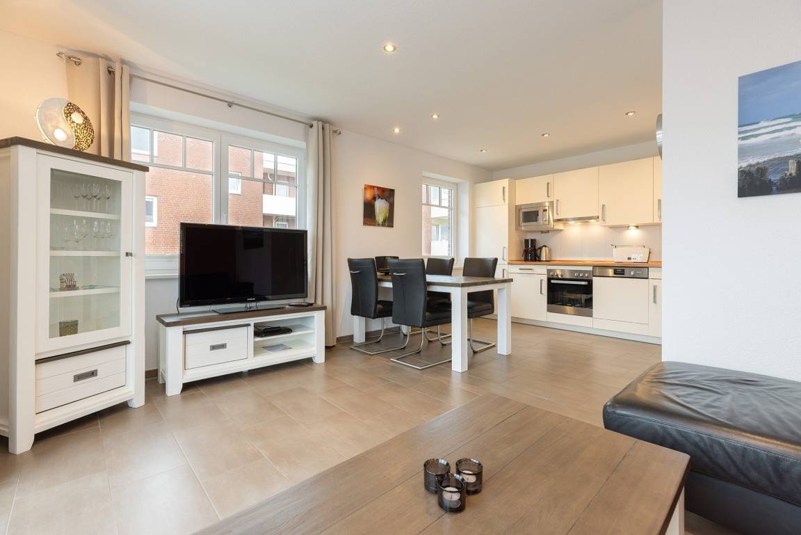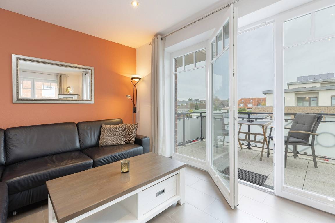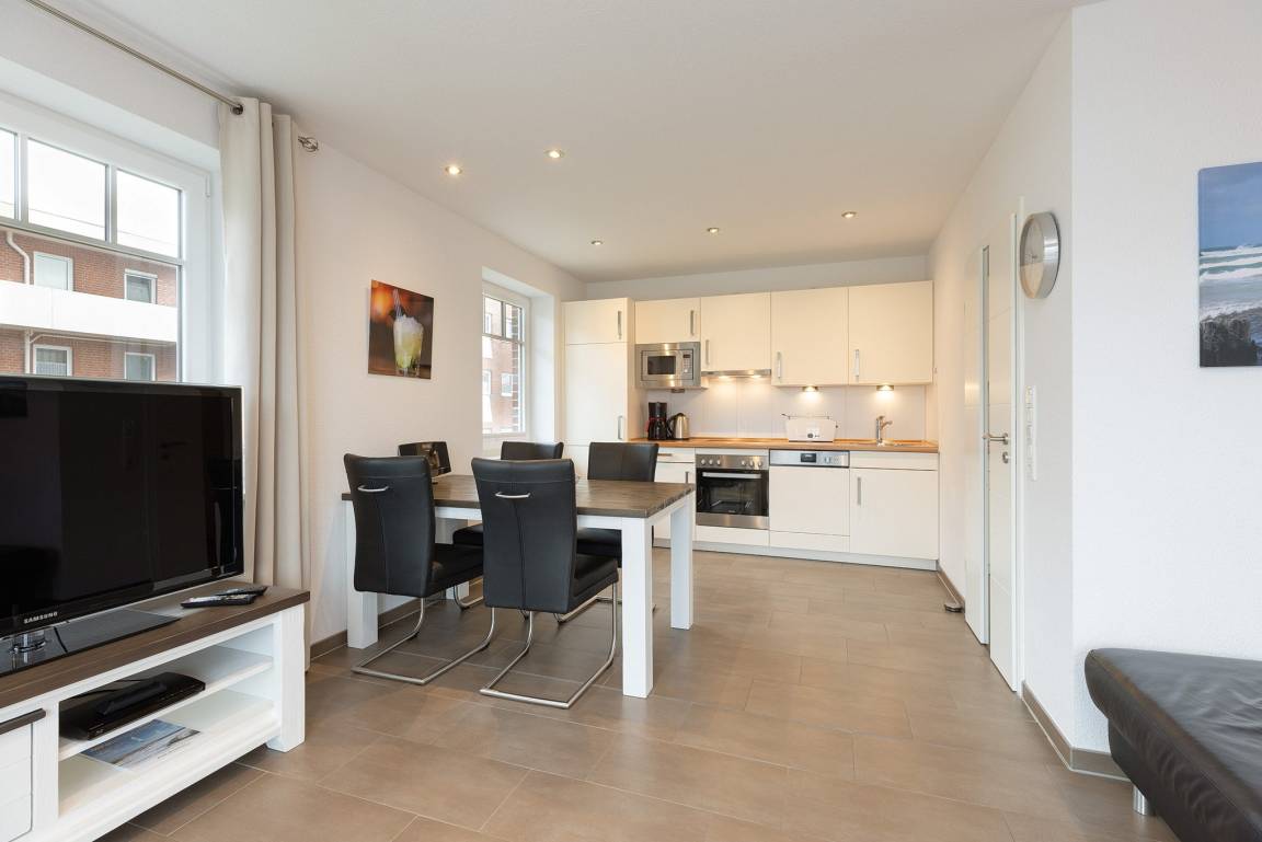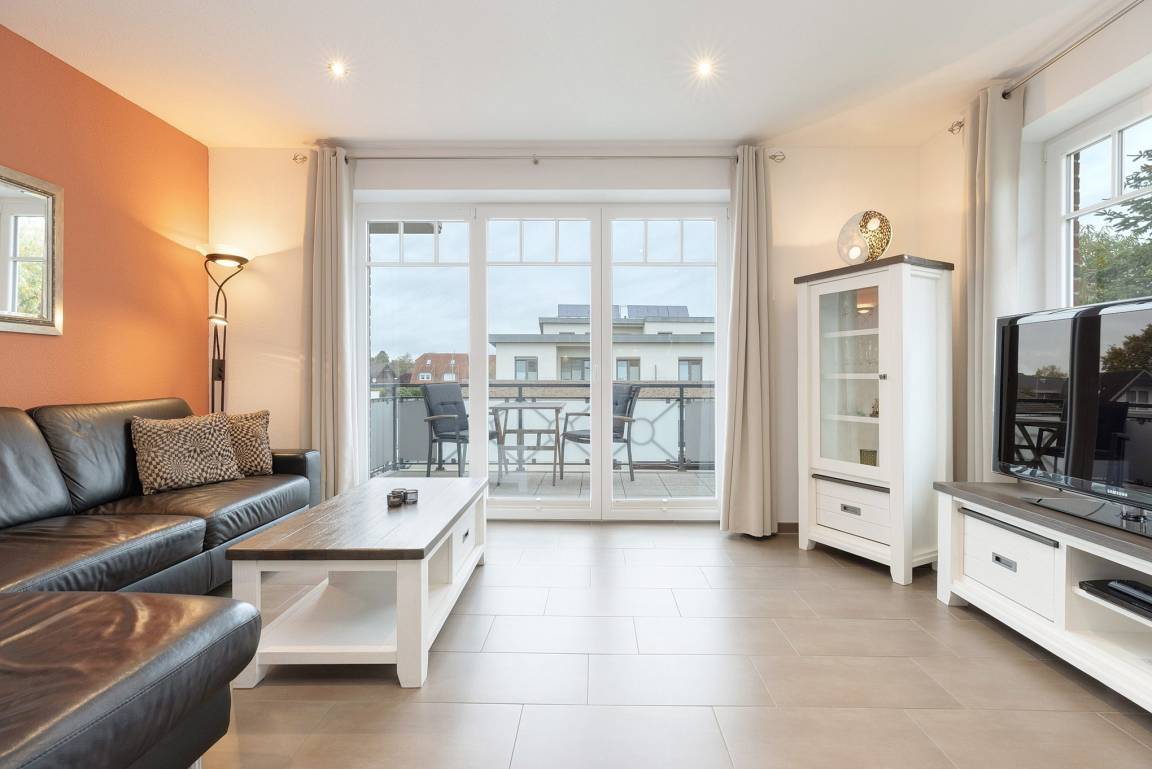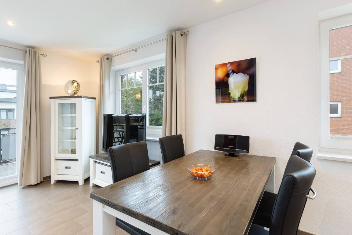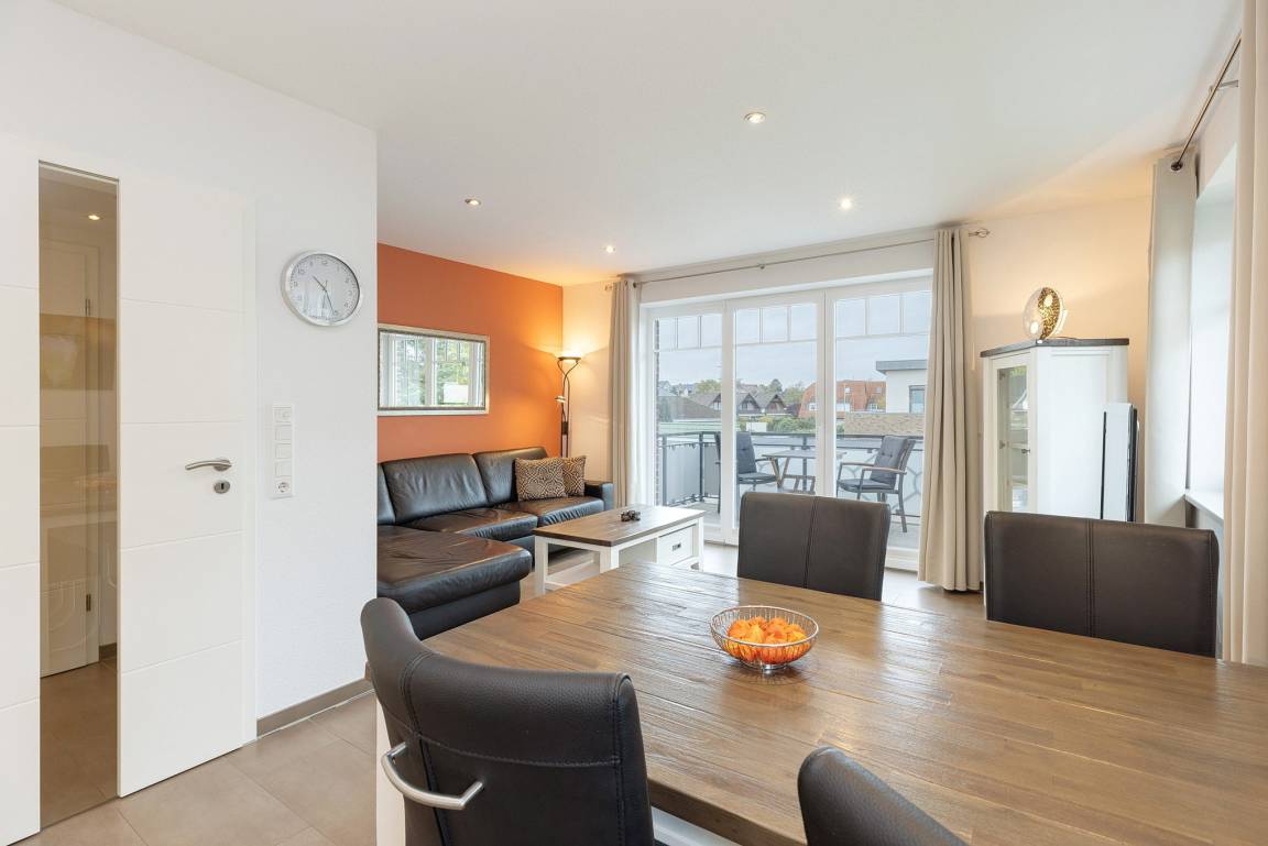 Wohn- und Esszimmer mit direktem Zugang zum Balkon. Das Wohn- und Esszimmer ist mit einem großen Esstisch, einer Eckledercouch und einem Couchtisch ausgestattet. Zur Unterhaltung stehen ein Flachbildschirm mit TV-und Mediathek-Funktion sowie ein Radio zur Verfügung. Das Wohn- und Esszimmer ist gefliest (Fußbodenheizung).