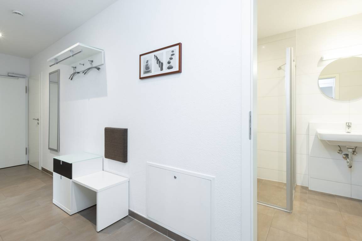 Hell gefliestes Bad mit ebenerdiger Dusche, WC und Waschbecken. Die Fußbodenheizung und die Handtuchheizung sorgen für angenehme Wärme.