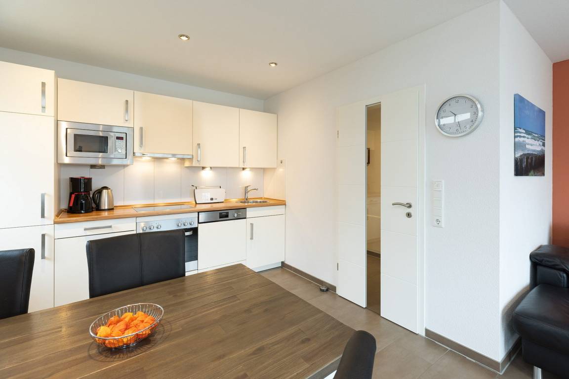 Moderne, zum Wohn- und Esszimmer offene Küchenzeile. Sie ist mit einem 4-Platten Cerankochfeld, einem Backofen, einem Kühlschrank mit kleinem 3-Sterne Gefrierfach, einer Spülmaschine, einem Toaster, Eierkocher, Wasserkocher, einer Mikrowelle und einer Kaffeemaschine ausgestattet.
