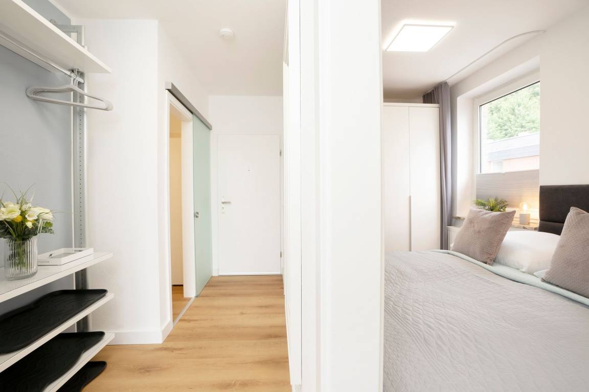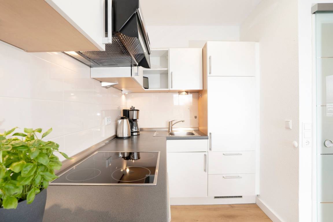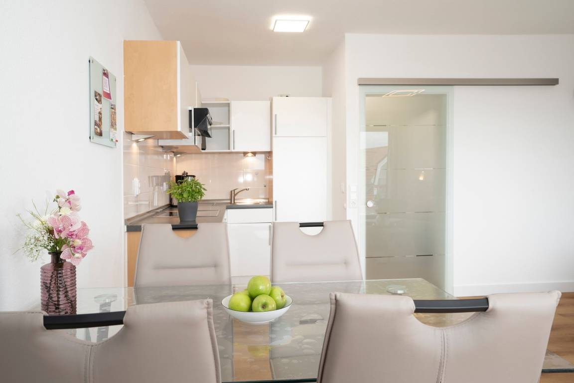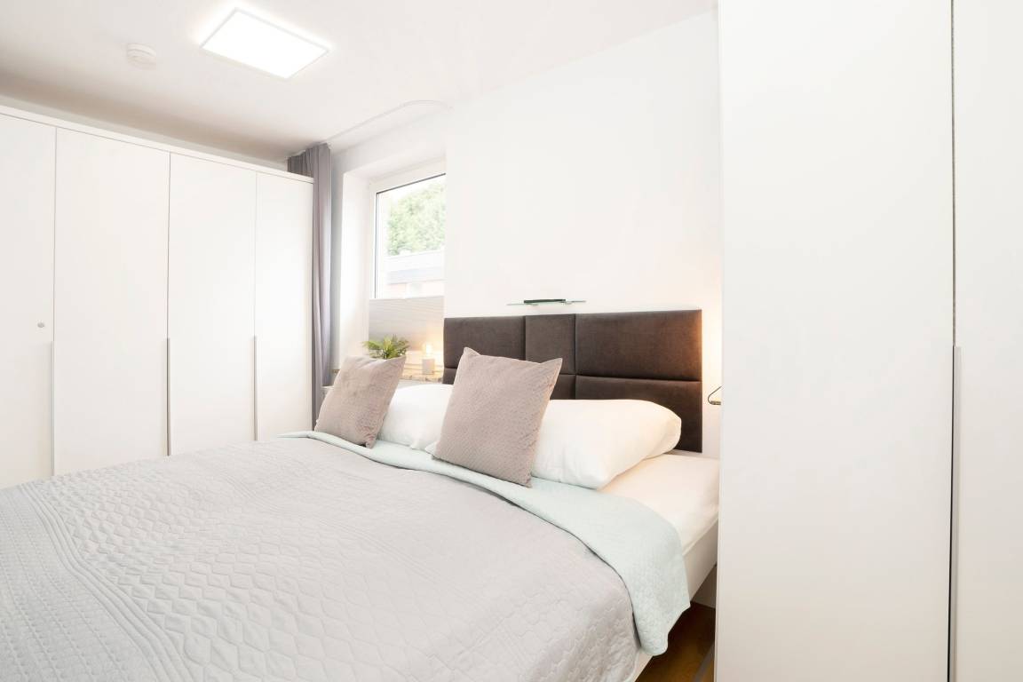 Diese Ferienwohnung wurde frisch renoviert und begrüßt seine Gäste mit klaren Linien und hellen Farben. Dank des offenen Raumkonzeptes ist die Familie beim Kochen, Essen, Spielen oder Fernsehen zusammen und kann sich austauschen. Das moderne Sofa verfügt zusätzlich über eine praktische Schlaffunktion (140x200 cm) und bietet somit Platz für zwei kleine Urlaubsgäste. Abends sitzt es sich gemütlich auf dem Balkon - bei einem Glas Wein und den Lichtern der Stadt können Sie hier den Tag ausklingen lassen. Ans Wohnzimmer angrenzend befindet sich das Schlafzimmer mit gemütlichem Doppelbett (2 x 90x200 cm), eigenem TV-Gerät und großem Kleiderschrank, in dem mühelos Koffer und Habseligkeiten untergebracht werden können. Das moderne Duschbad lässt Sie erfrischt in den Tag starten und bietet genügend Stauraum für Ihre Hygieneartikel.