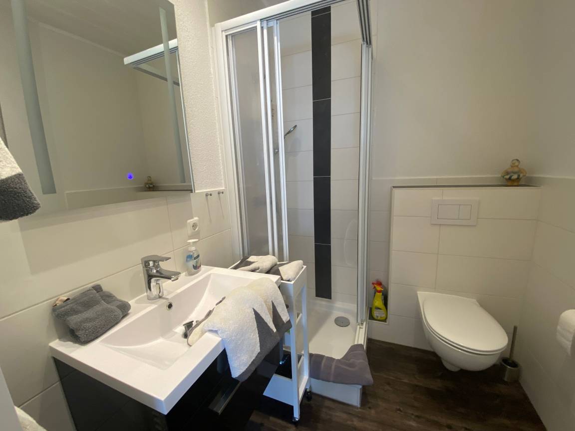 1 Schlafraum mit Doppelbett und angrenzendem kombinierten Bad/WC mit Föhn und Personenwaage