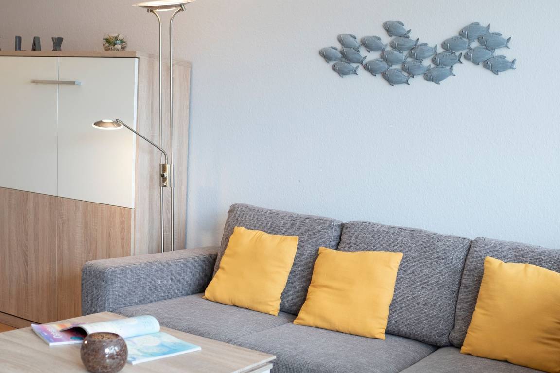 Ein kombinierter Wohn-/Essraum mit integrierter, gut ausgestatteter Küchenzeile bildet das Herzstück der Ferienwohnung. Im Wohnzimmer sorgen ein hochwertiges Sofa, ein bequemes Schrankbett (140x200 cm) sowie ein moderner Flachbildfernseher für Komfort und Unterhaltung. Im separaten Schlafzimmer befinden sich zwei Einzelbetten (je 80x200). Das Badezimmer ist modern mit WC, Waschbecken, Spiegel, Dusche und Föhn ausgestattet. Im Flur stehen Einbauschränke mit viel Stauraum zur Verfügung. Außenjalousien sorgen für angenehme Verdunklung. Auf dem großen, möblierten Süd-Balkon mit Blick in Richtung Deich können Sie zahlreiche Sonnenstunden genießen.