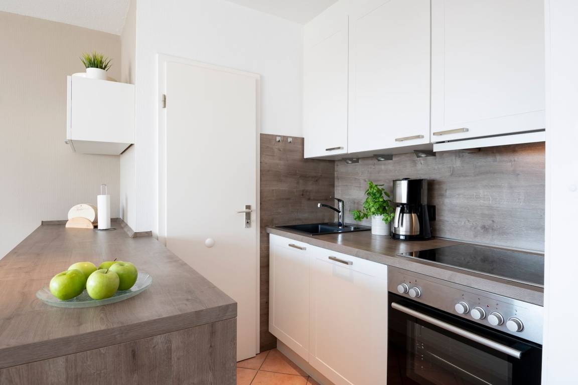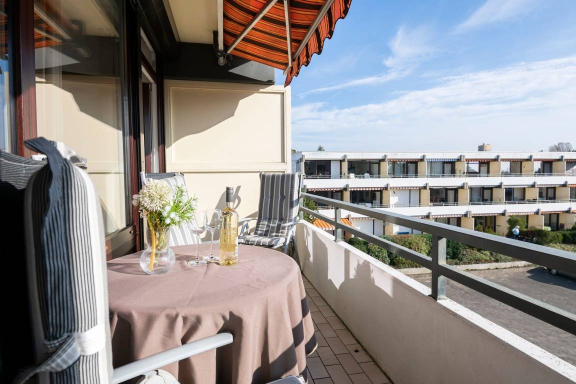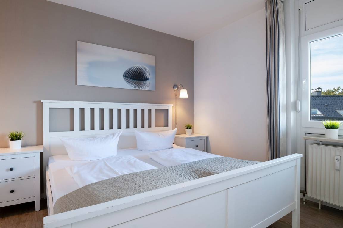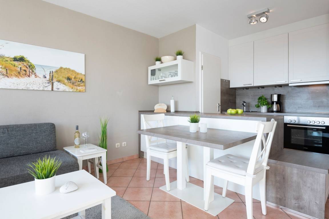 Die Wohnung verfügt über einen hellen Wohn-Schlafraum mit großer Schlafcouch und elektrischen Rollläden zur Verdunklung, sowie einen 42-Flachbildfernseher mit 3D-Technik. Zudem befindet sich im Wohnbereich der Esstisch mit vier Sitzgelegenheiten und eine offene, voll ausgestattet Wohnküche mit Spülmaschine. Vom Wohnzimmer aus gelangen Sie auf den Balkon mit Südost-Ausrichtung und saisonalem Ostsee-Fernblick. Genießen Sie ruhige Nächte im Schlafzimmer mit bequemen Doppelbett (2x90x200 cm), 32-Flachbildfernseher und Rollläden. Das Badezimmer ist gradlinig und modern gehalten und ausgestattet mit einer Dusche und WC. Über den kostenfreien WLAN-Zugang können Sie nicht nur bequem die Urlaubsbilder mit Freunden teilen - Sie können auch über das Internet-Radio mit USB und Bluetooth eine Wohlfühlatmosphäre schaffen.