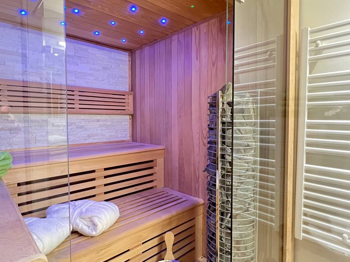 Das Badezimmer liegt zwischen den beiden Schlafräumen. Es ist eingerichtet mit einer ebenerdigen Wellnessdusche und einer Sauna. Eine Waschmaschine ist ebenfalls vorhanden.