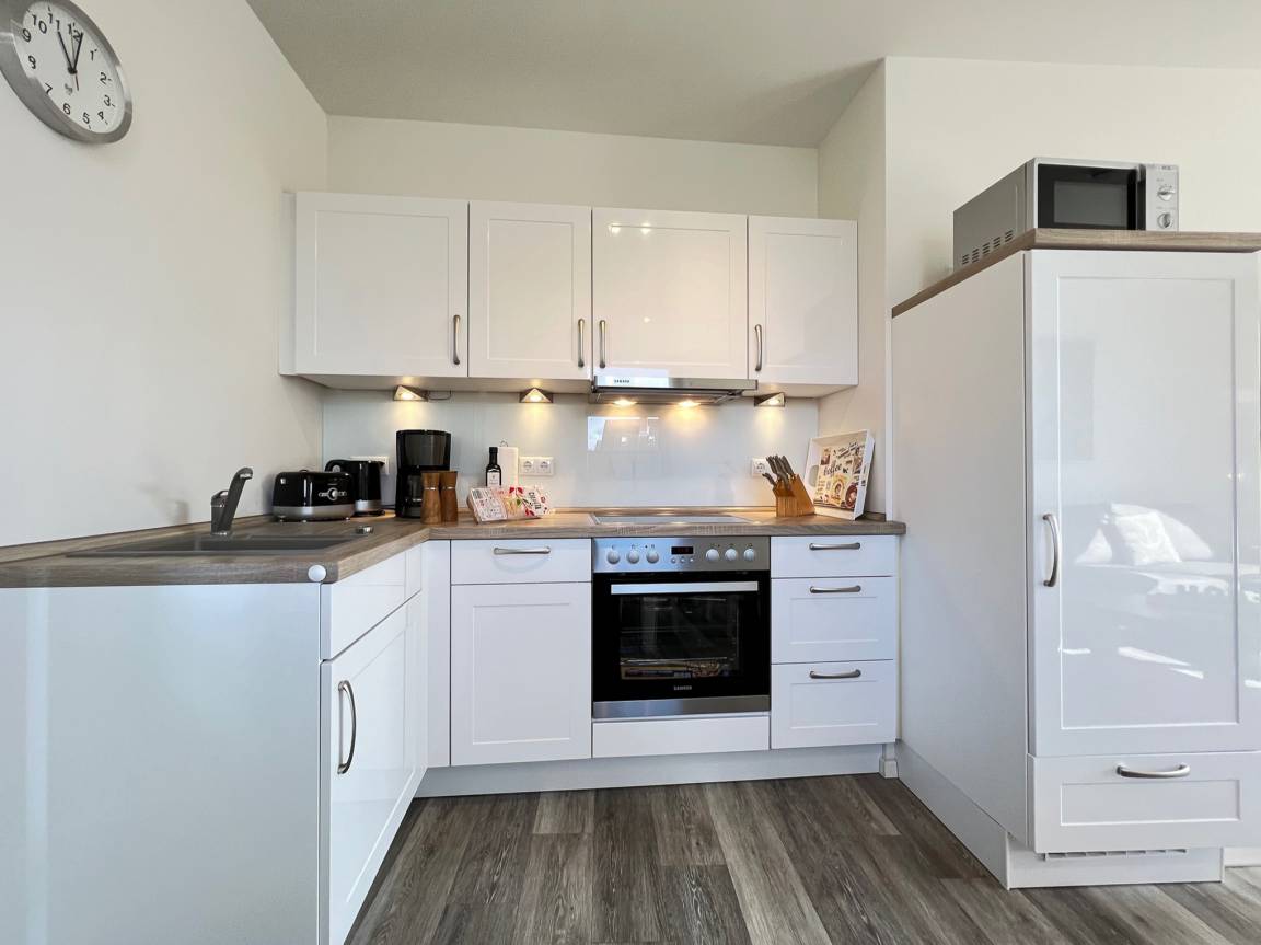 Die schöne 3-Zimmerwohnung für 2-4 Personen mit eigenem Eingang befindet sich im Erdgeschoss und verfügt über eine in den Wohn-/Essbereich integrierte umfangreich ausgestattete Komfort-Küche (Cerankochfeld, Backofen, Mikrowelle, Spülmaschine, Kühlschrank mit Gefrierfach etc.).