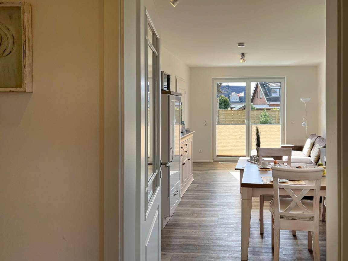 Vom Flur aus gelangt man in das sonnen-helle Wohn- und Esszimmer (mit Flachbild-TV, Hifi-Anlage und kostenlosem Internetzugang). Der komfortable Wohnbereich ist mit hellen modernen Möbeln ausgestattet. Von dort aus gelangt man auf die großzügige Süd-Terrasse (2 Wellnessliegen, Terrassenmöbel, Sonnenschirm).