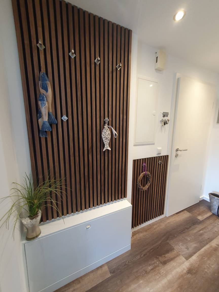 Der Flur ist großzügig mit im Winter beheizter Garderobe und mit einem Schuhregal ausgestattet.