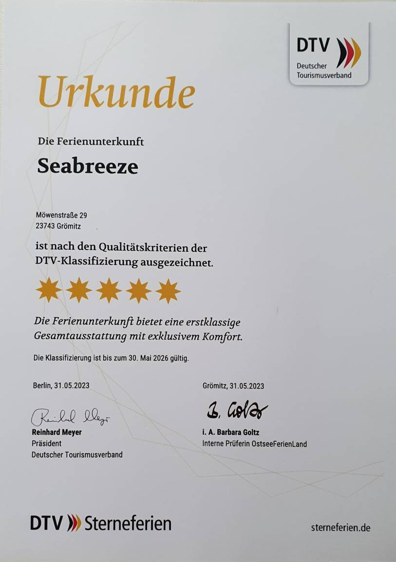 Die 5-Sterne-Wohnung "Seabreeze" verfügt über zwei vollwertigen Schlafzimmern, ausgestattet jeweils mit hochwertigen Boxspring-Doppelbetten (180 x 200 und 160 x 200 cm). Ein Safe und ein zusätzlicher Flat-TV mit DVD-Spieler sind im zweiten Schlafzimmer ebenfalls vorhanden. Die Schlafzimmerfenster sind mit Verdunklungsplissees (Black-Out-Plissees) versehen. Mückenschutz. Fußbodenheizung.
