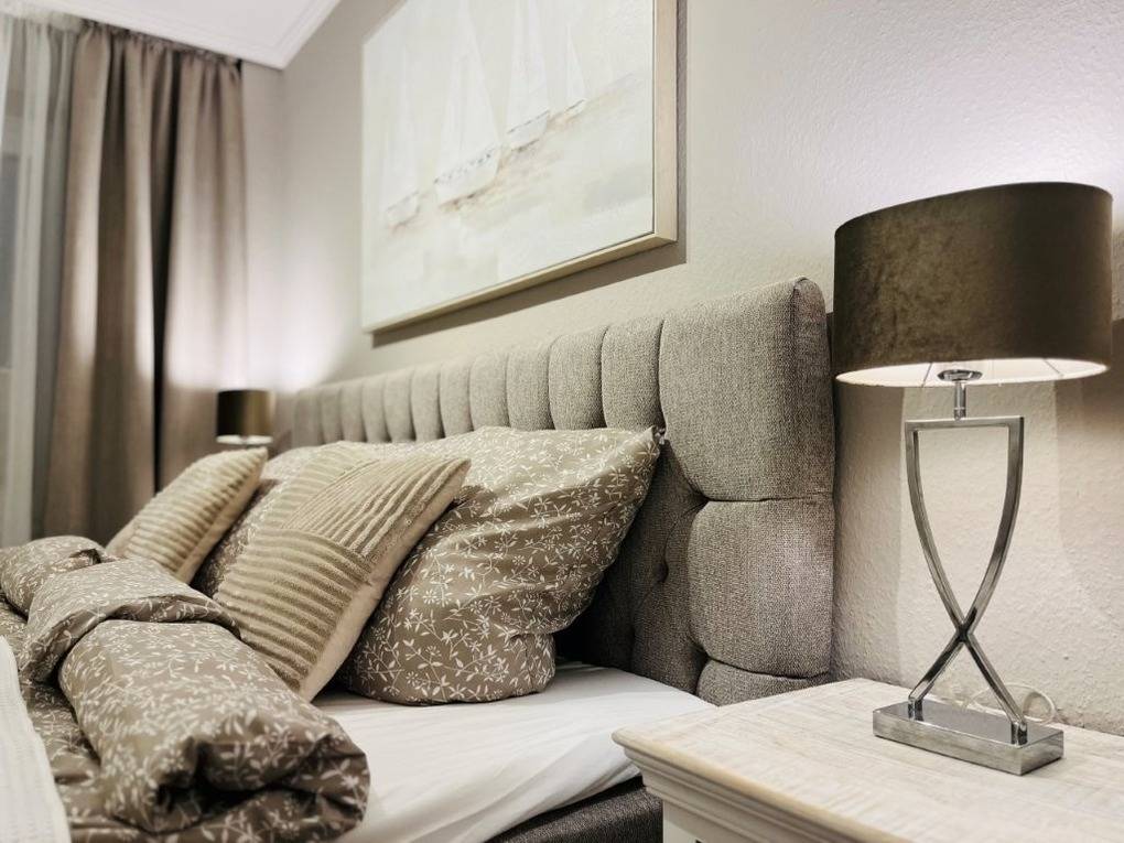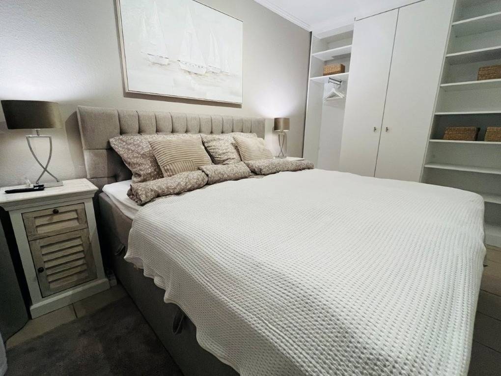 Das Schlafzimmer verfügt über ein geräumigen Kleiderschrank, ein hochwertiges Boxspringbett und einen weiteren Fernseher. Ein Verdunkelungsplissee sorgt für einen erholsamen Schlaf.