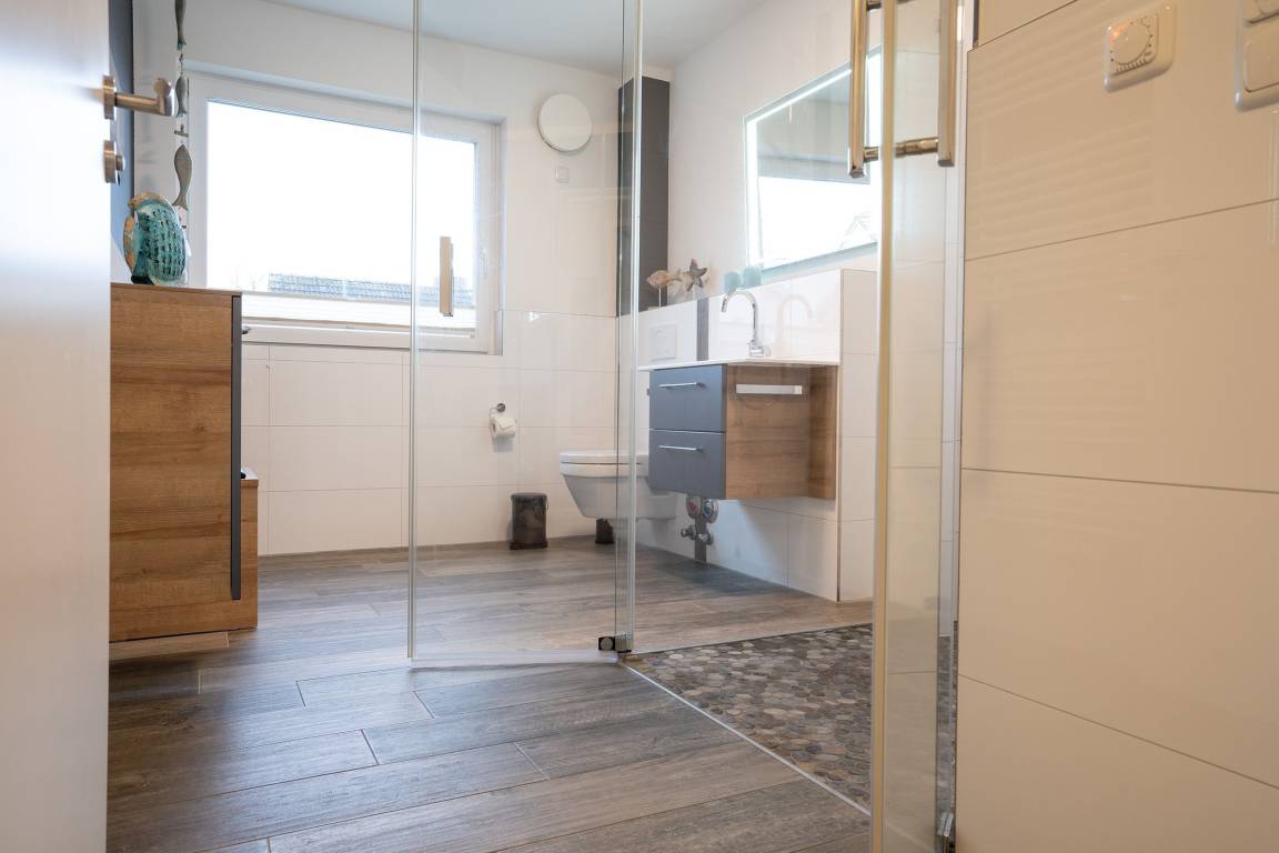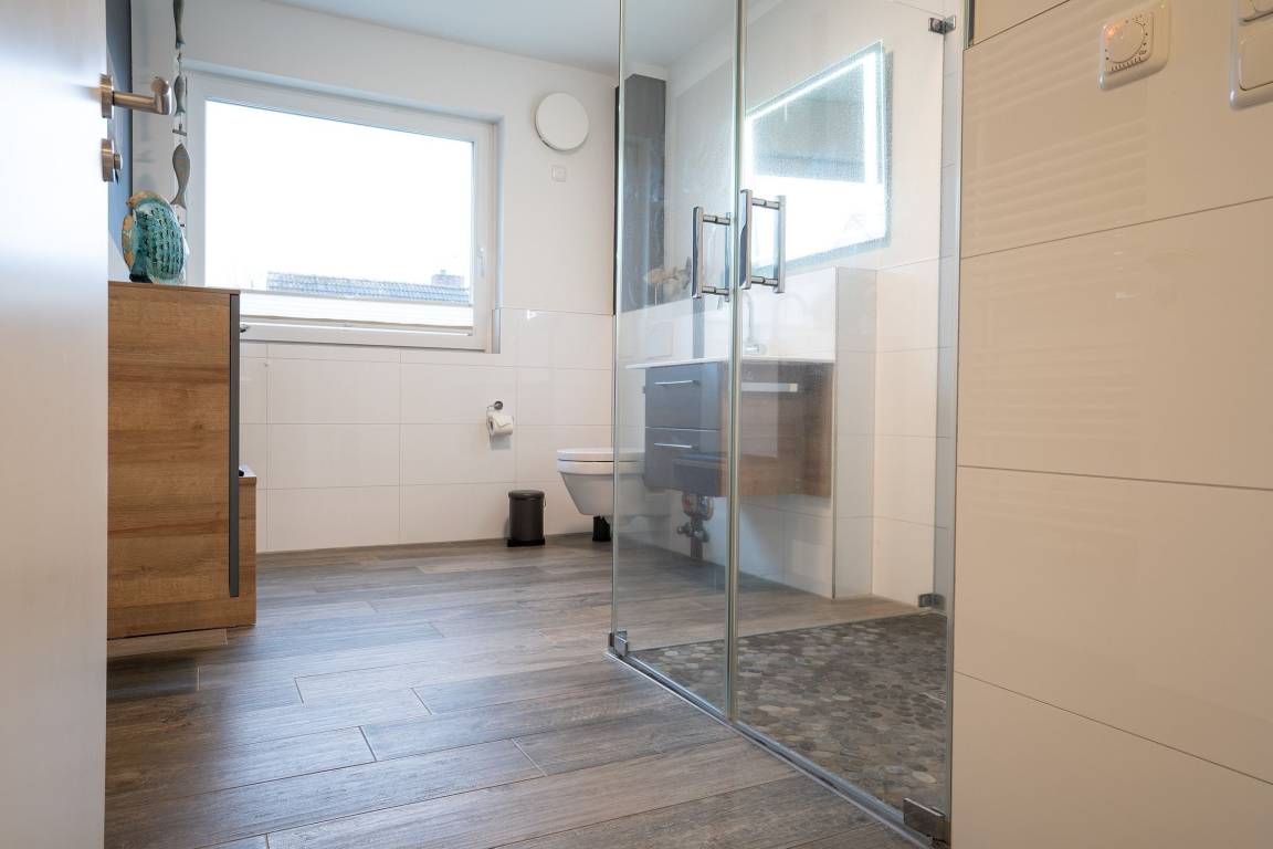 Die Wohnung ist mit einer Wärmerückgewinnungsanlage ausgestattet und auch die 3-fach Verglasung in der Verbindung mit der ganzheitlichen Fußbodenheizung versorgt von der Pelletheizung trägt zu einem perfekten Wohnklima bei. Weiterhin ist die gesamte Wohnung in Energie sparender LED-Beleuchtung ausgeführt, damit die Versorgung durch Fotovoltaik ausreichend ist.