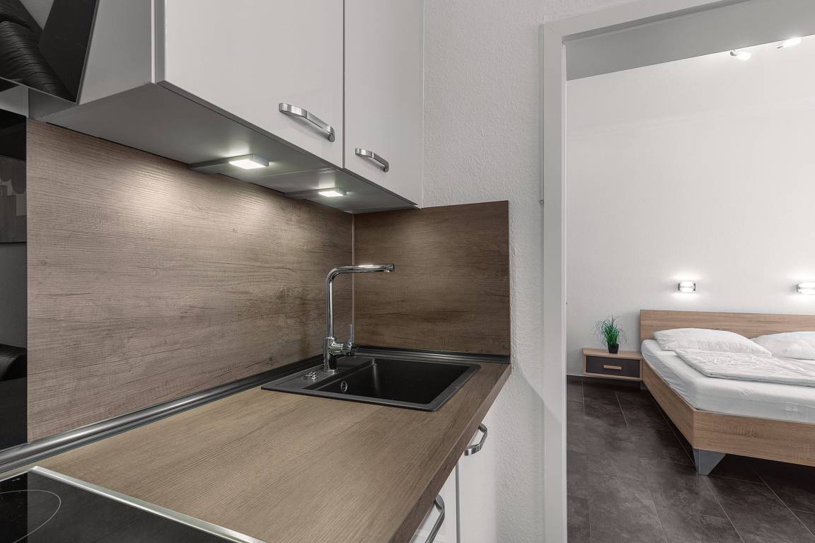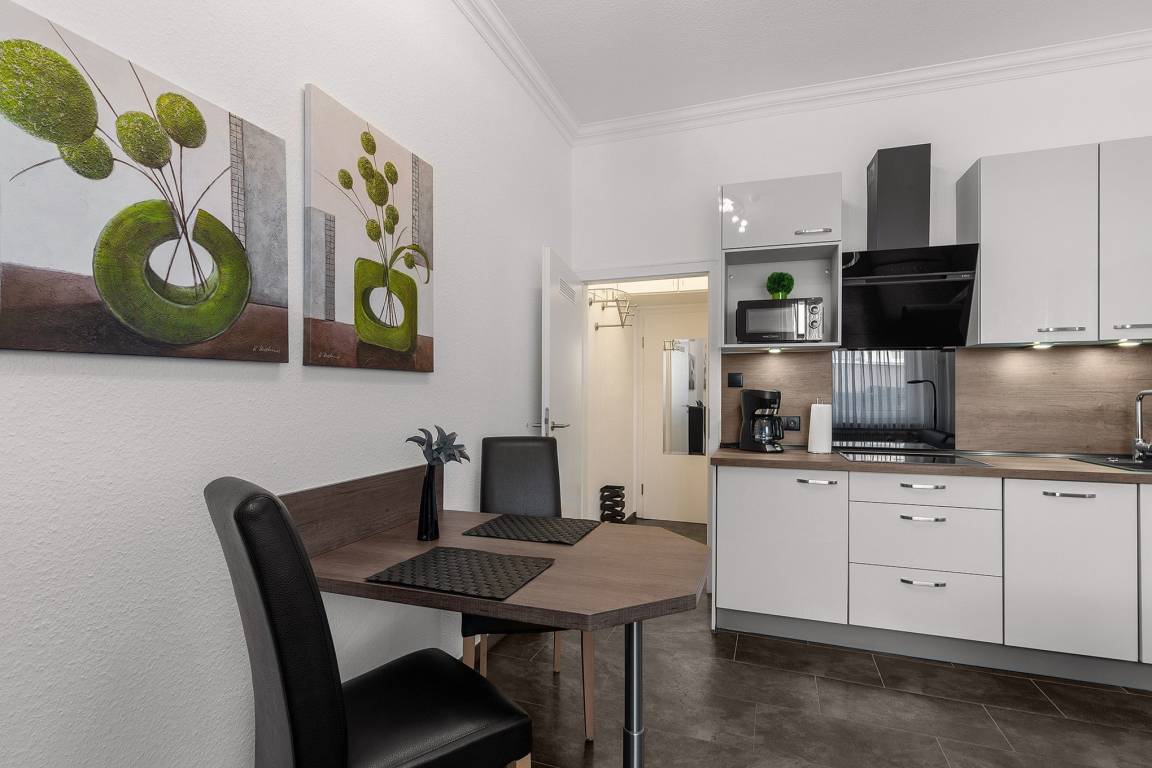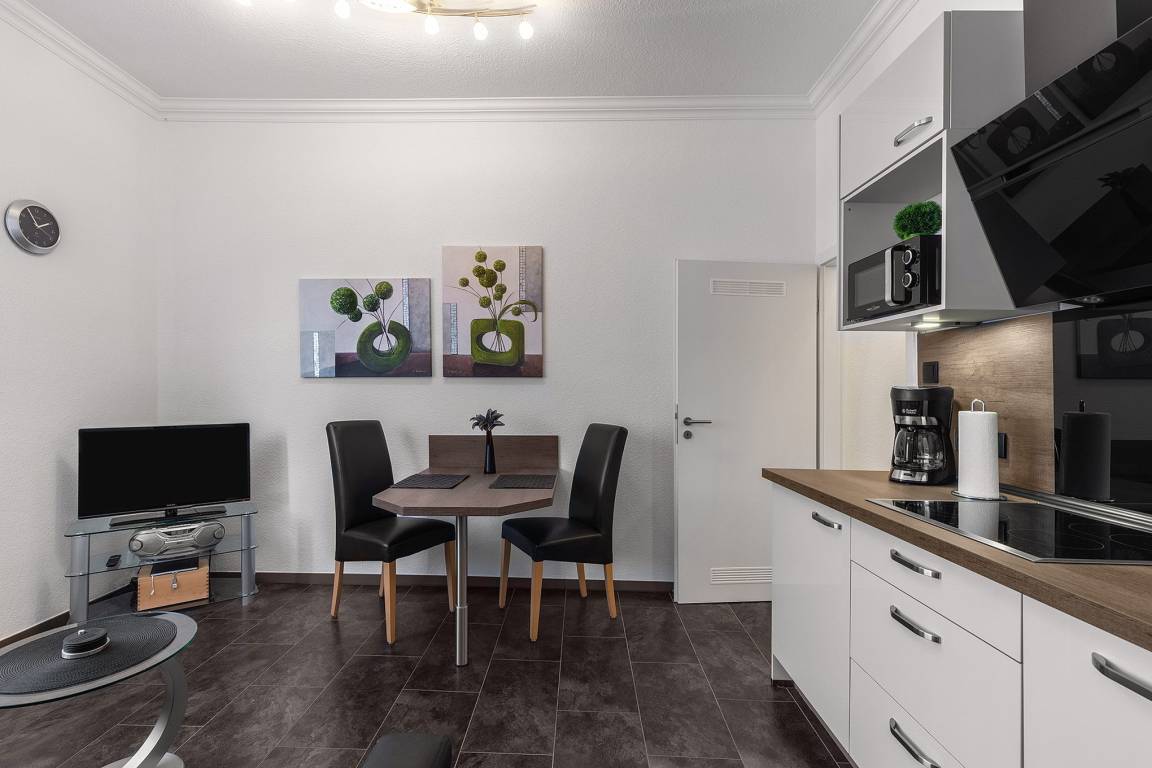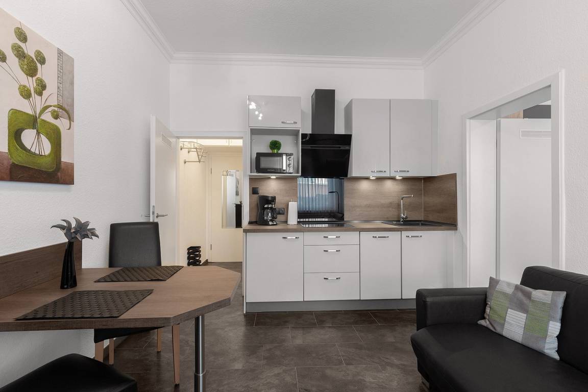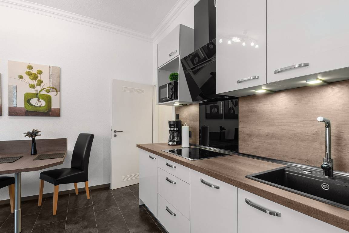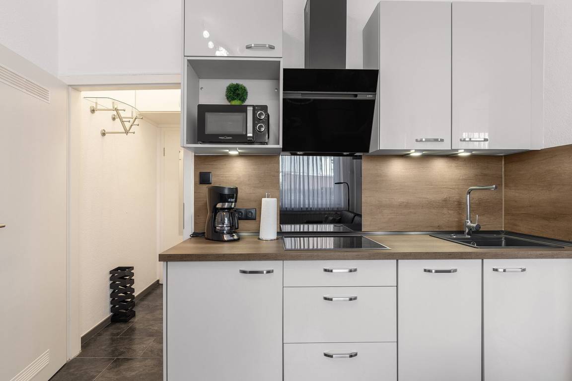 Die Küchenzeile ist vollständig mit einem Ceran-Kochfeld, Spülmaschine, Mikrowelle, Kaffeemaschine, Eierkocher, Mini-Back-Automat, Wasserkocher, Toaster und einem Kühlschrank mit 3 Sterne-Gefrierfach ausgestattet.