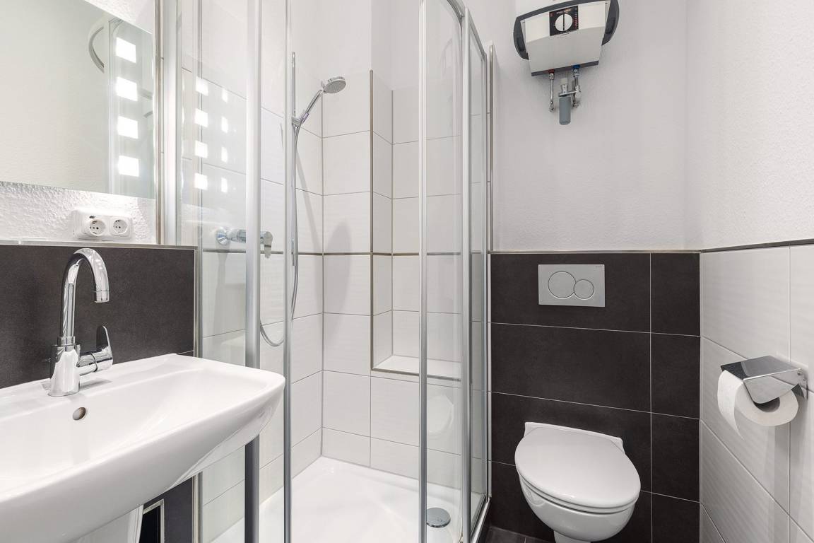 Im neuen, hellen und schick eingerichteten Bad findet der Gast u. a. eine Glasdusche mit Sitzmöglichkeit sowie eine komfortable Handtuchheizung. Die Warmwasserversorgung erfolgt über einen leistungsstarken, großen Boiler.