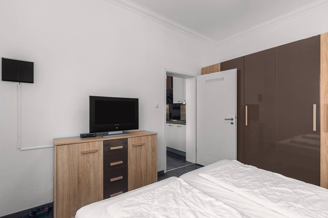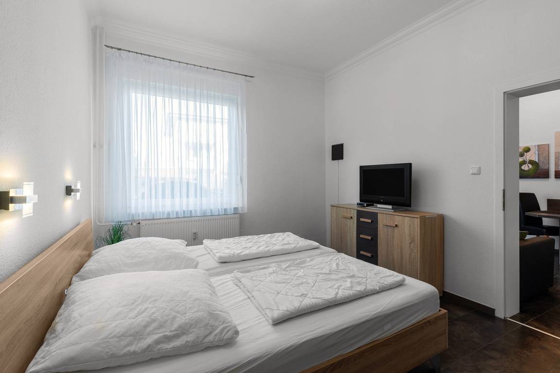 Im separaten und gemütlichen Schlafzimmer mit einem großen Fenster und Außenrollo befindet sich ein großes Doppelbett (2x100x200cm) und ein großer Kleiderschrank. Zur Unterhaltung steht ein Fernseher (16 Programme) zur Verfügung.
