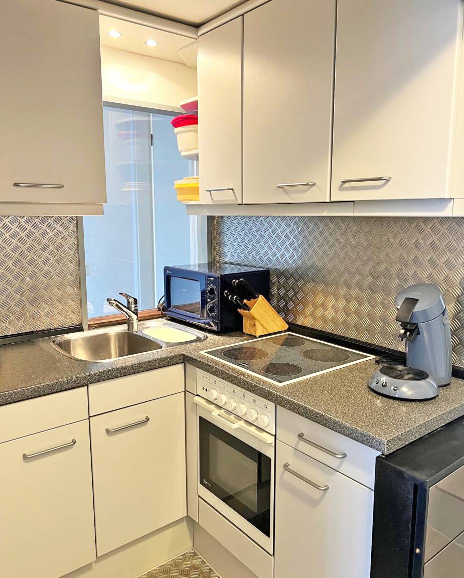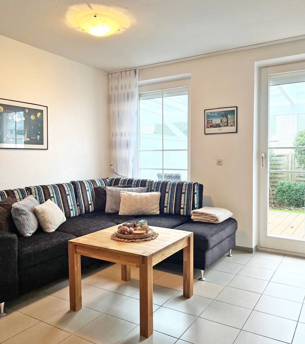 Vom Eingangsbereich gelangen Sie zu der kleinen, offenen Küche. Diese ist ausgestattet mit Kühlschrank mit Gefrierfach, Ceranfeld, Backofen, Mikrowelle, Toaster, Wasserkocher und Eierkocher. Über zwei Stufen gelangen Sie in das Wohnzimmer mit Smart-TV, hochwertiger Schlafcouch (140cmx200cm) und dem Essbereich für 4 Personen. Bodentiefe Fenster öffnen den Blick zur überdachten Terrasse mit Essplatz für 4 Personen und einer Sonnenliege. Das Erdgeschoss ist gefliest.
