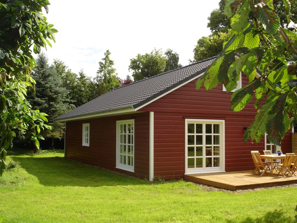 Im 70 qm großen Schwedenhaus genießen die Gäste modernen Komfort mit eigener Terrasse und Zugang zum Garten auf einer Ebene. Es verfügt über ein Elternschlafzimmer mit Boxspringsbett und ein Kinderschlafzimmer mit Hochbett und Einzelbett. Eine komplett ausgestattete Küche und das Badezimmer mit Badewanne und Dusche machen die Einrichtung komplett.