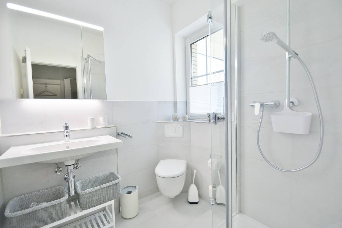 Hell gefliestes Tageslichtbad mit Dusche, Waschbecken und WC.