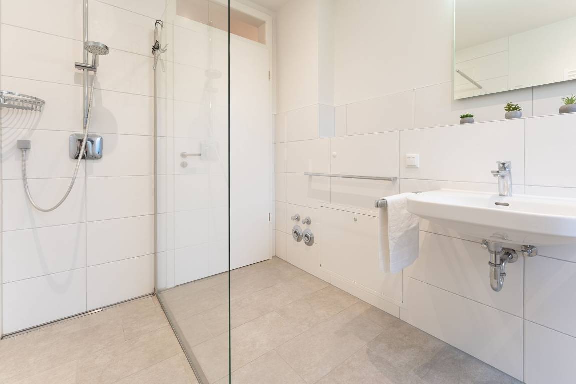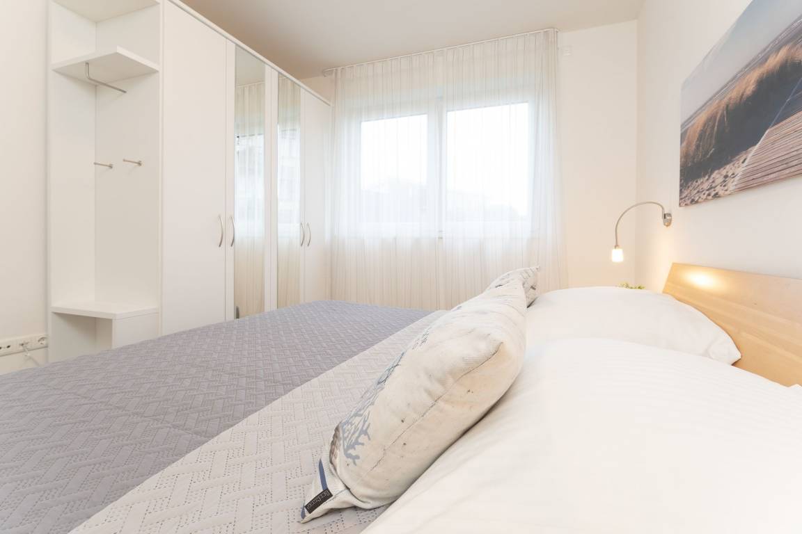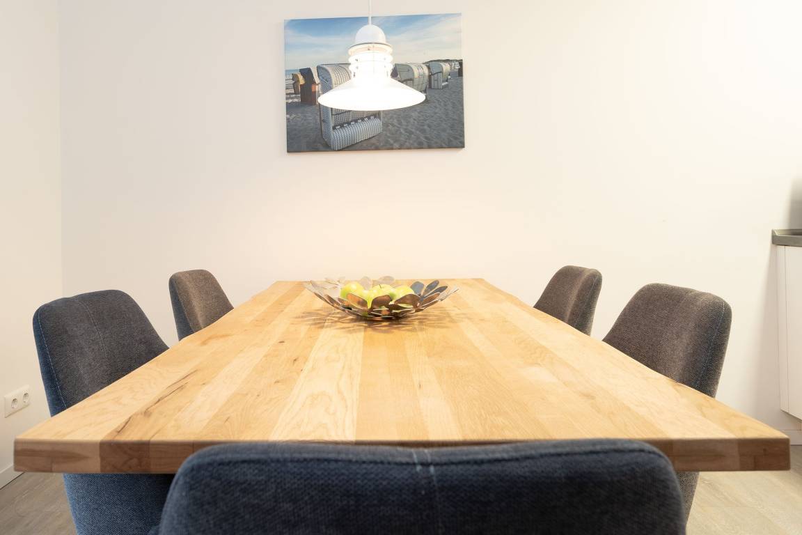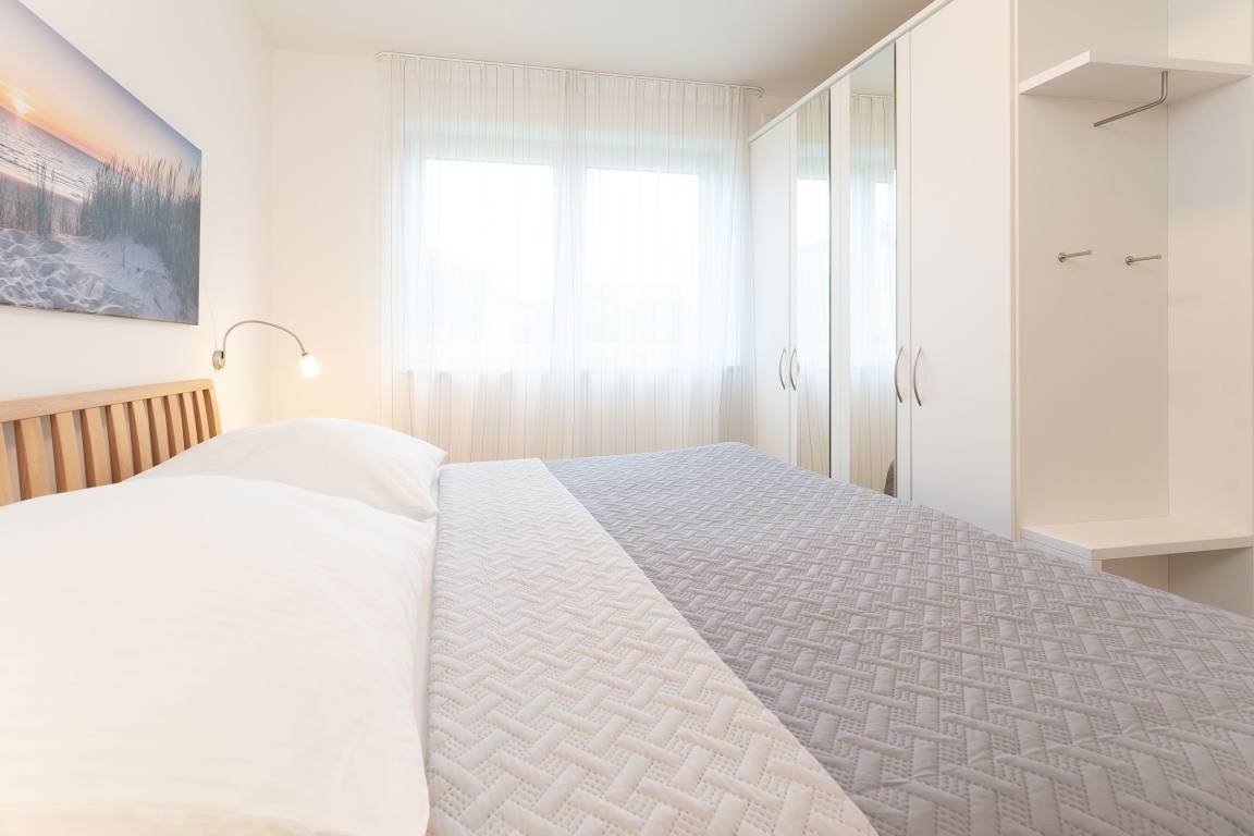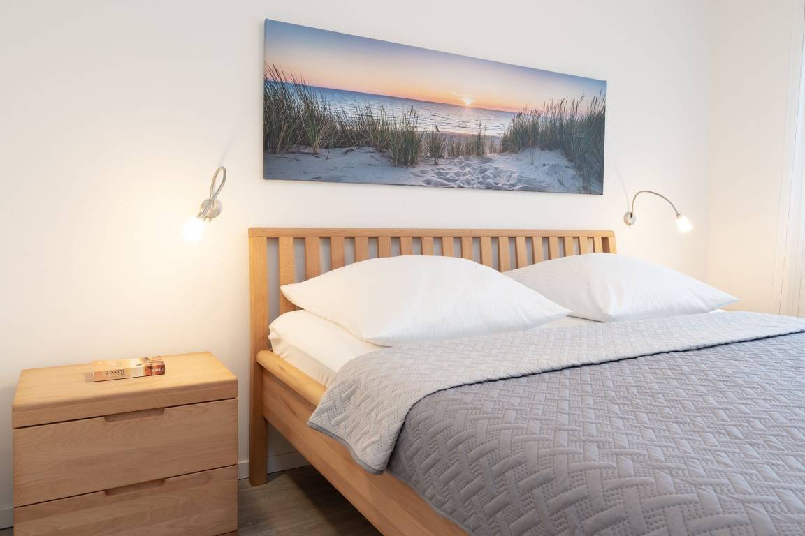 Ein offen und modern gestalteter Wohnbereich bildet das Zentrum Ihres Urlaubsreiches. Von dort aus gelangen Sie auf die Sonnenterrasse inklusive eigenem Strandkorb, Elektrogrill und großzügigem Garten. Das Wohnzimmer bietet mit HiFi - Anlage und Smart TV gute Unterhaltung, während in der offenen Wohnküche das Abendessen auf dem Induktionsherd köchelt. Das Schlafsofa lässt sich ausklappen und als Bett (150x200cm) für eine Einzelperson nutzen. Die weiteren Gäste verteilen sich auf die beiden Schlafzimmer, die jeweils über einen Kleiderschrank, elektrische Außenjalousien und ein großes Doppelbett (2x 90x200cm) verfügen. Als weitere Räume finden Sie hier einen Abstellraum, ein separates Gäste-WC, sowie das Tageslichtbad mit ebenerdiger Dusche und beheizbarem Handtuchhalter. Besonderen Komfort bietet die Fußbodenheizung in der gesamten Wohnung.
