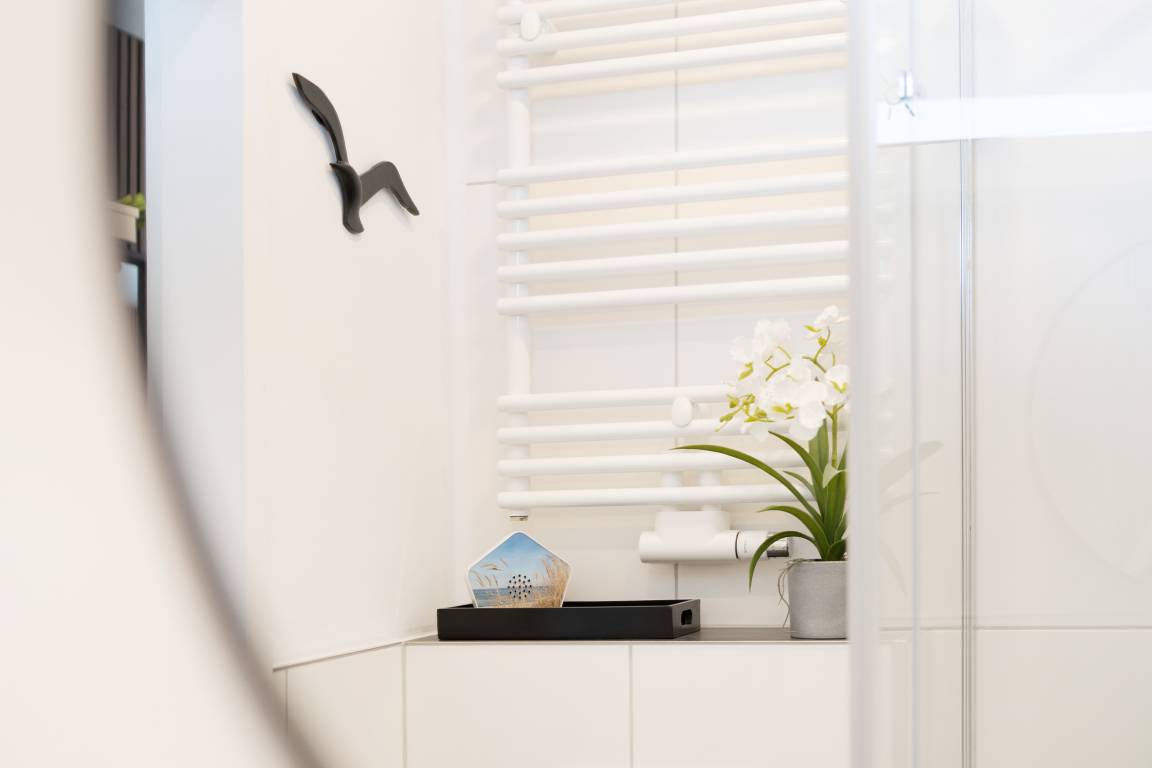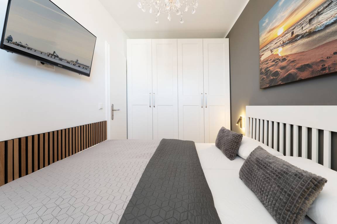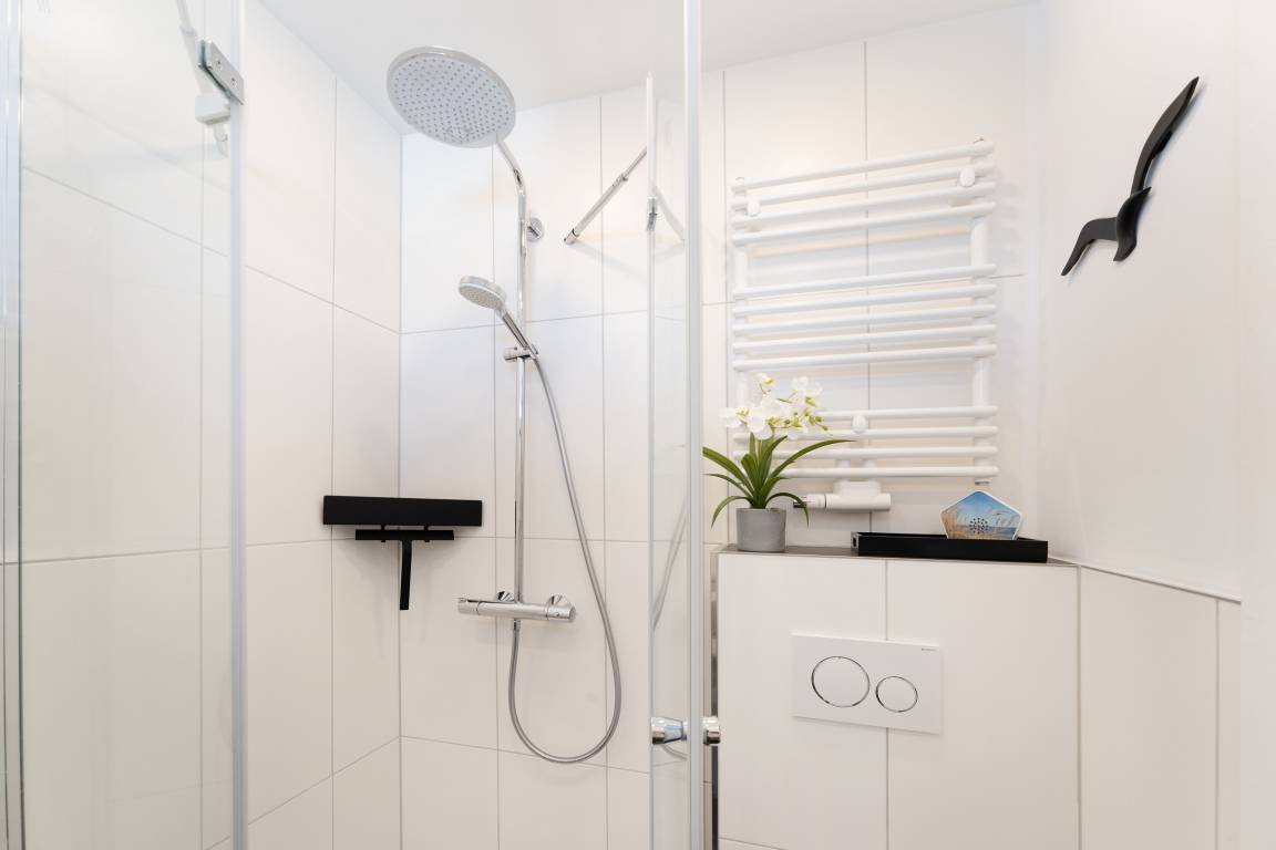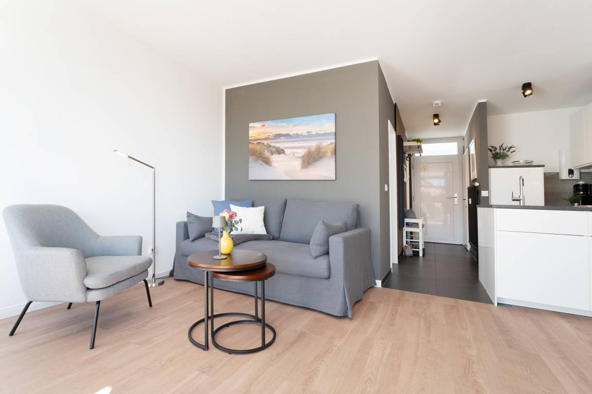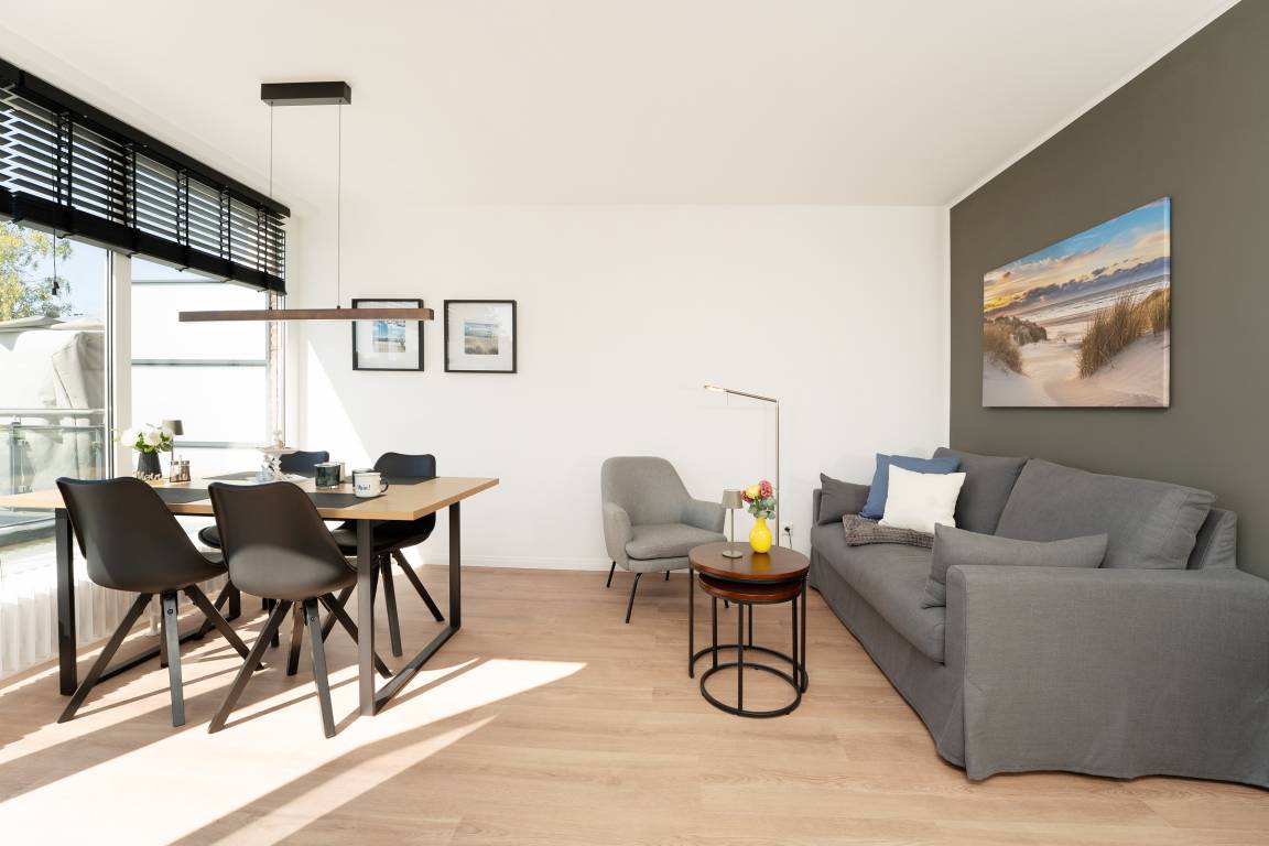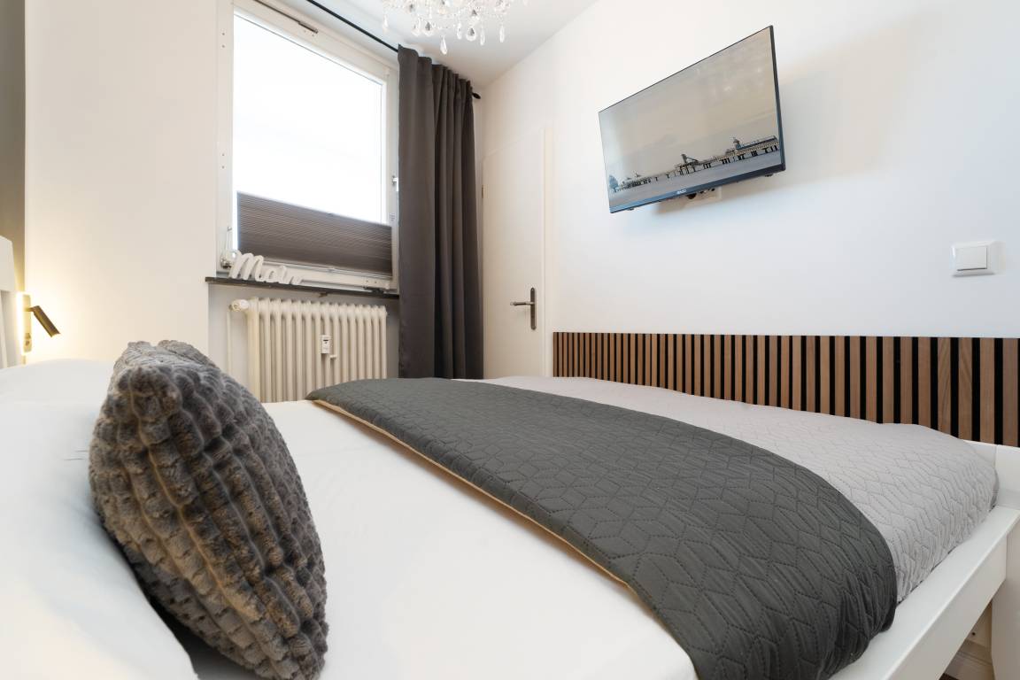 Der helle Wohnbereich lädt mit bequemen Sitzmöglichkeiten und einem Fernseher zu entspannten Stunden ein. Von hier aus gelangen Sie auf den möblierten Balkon, der zum Verweilen an der frischen Ostseeluft einlädt. Die offene Küchenzeile ist modern ausgestattet und verfügt über Backofen, Geschirrspülmaschine, Kühlschrank, Mikrowelle, Kaffeemaschine, Toaster und weitere nützliche Utensilien. Im Schlafzimmer sorgt ein komfortables Doppelbett (2x 80x200 cm) für erholsamen Schlaf. Das Badezimmer ist mit Dusche und WC ausgestattet.