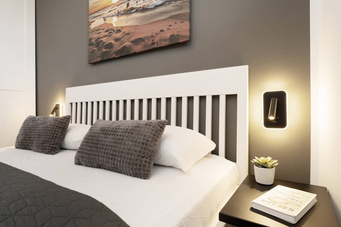 „Tolle, helle Wohlfühl-Wohnung! Gemütlich und stilvoll eingerichtet, sehr gute Ausstattung. Ich, alleinreisend und mobil arbeitend, habe nichts vermisst und meine Zeit sehr genossen. Bei Sonne wird die Wohnung sehr warm, was ab Ende September ein Vorteil ist. Innerhalb von 5-7 Minuten sind Strand, Stadt und Supermarkt erreichbar. Würde wiederkommen!“