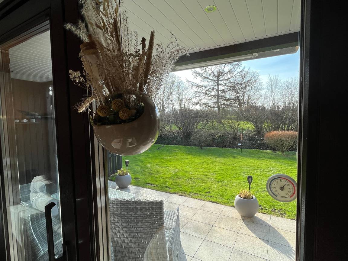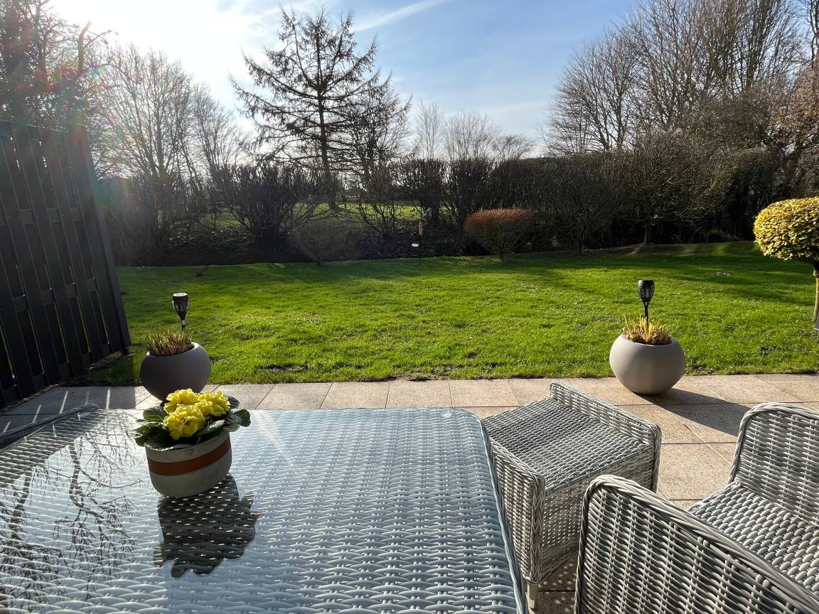 Im modernen Wohnbereich befinden sich eine Schlafcouch, ein Kamin, ein Essplatz mit 3 Stühlen, ein Fernseher sowie Zugang zur sonnigen, möblierten Terrasse mit großzügigen Garten.
