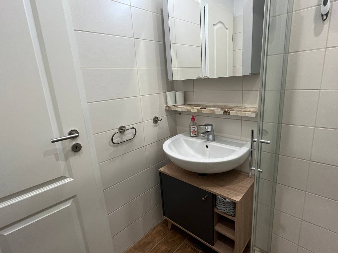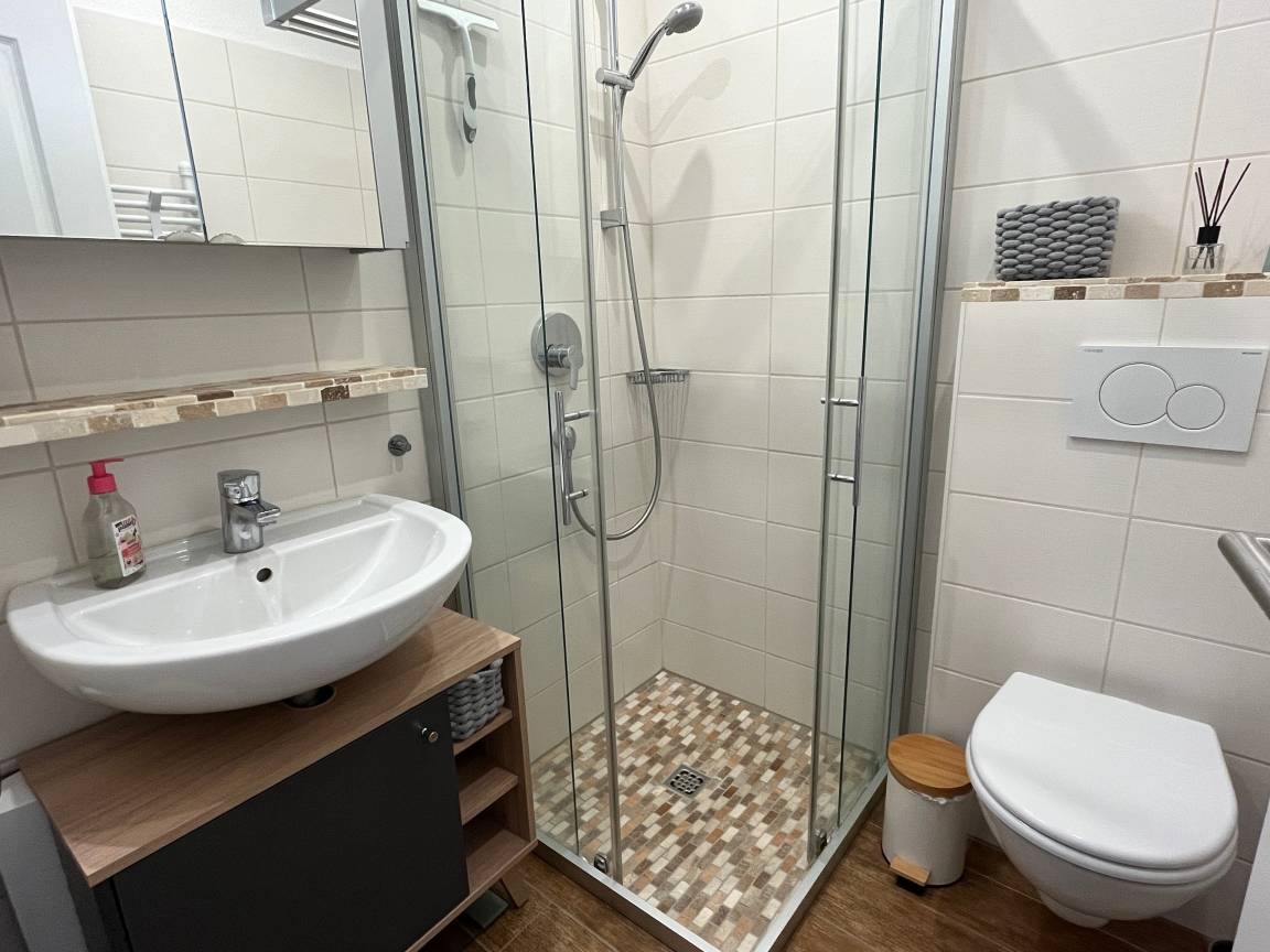 Im Bad steht Ihnen eine Dusche, WC und Waschbecken mit Handtuchwärmer und Föhn zur Verfügung.