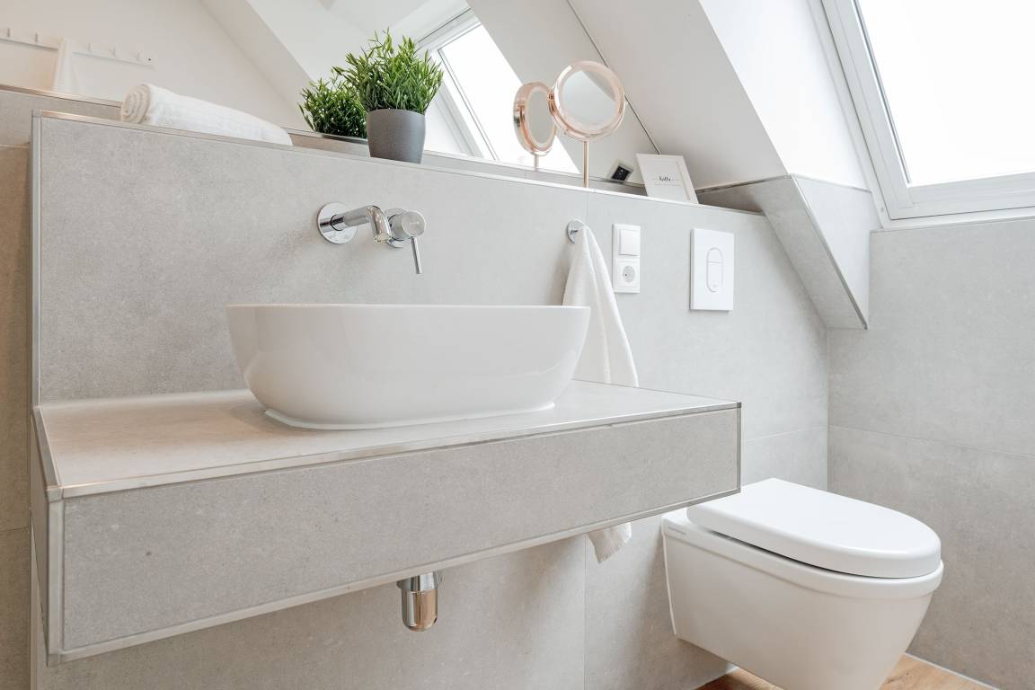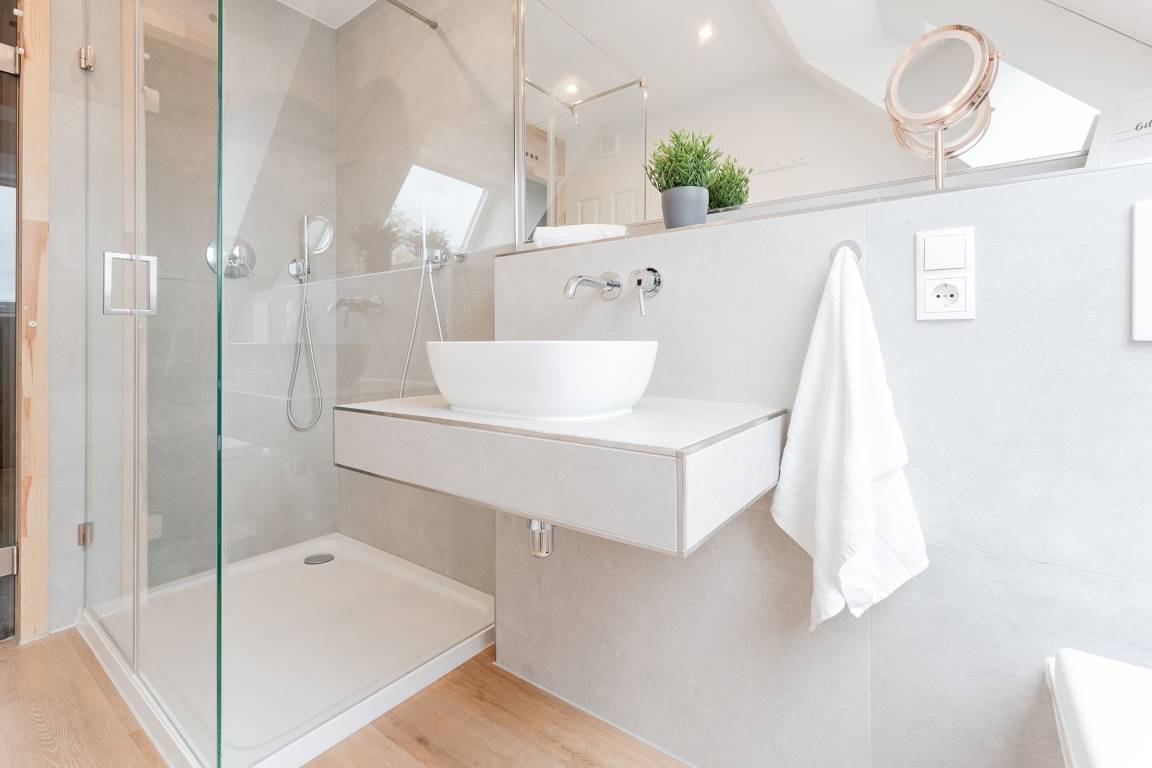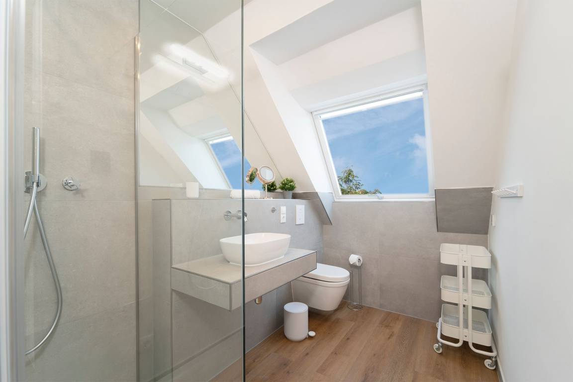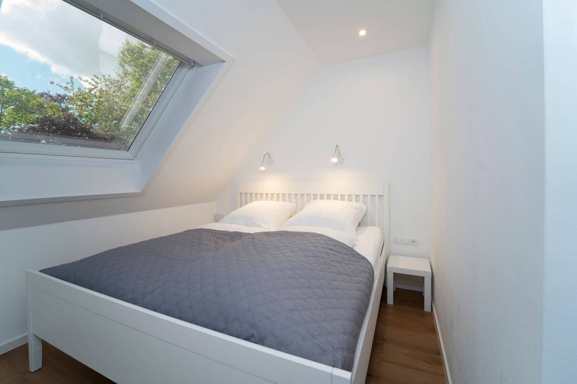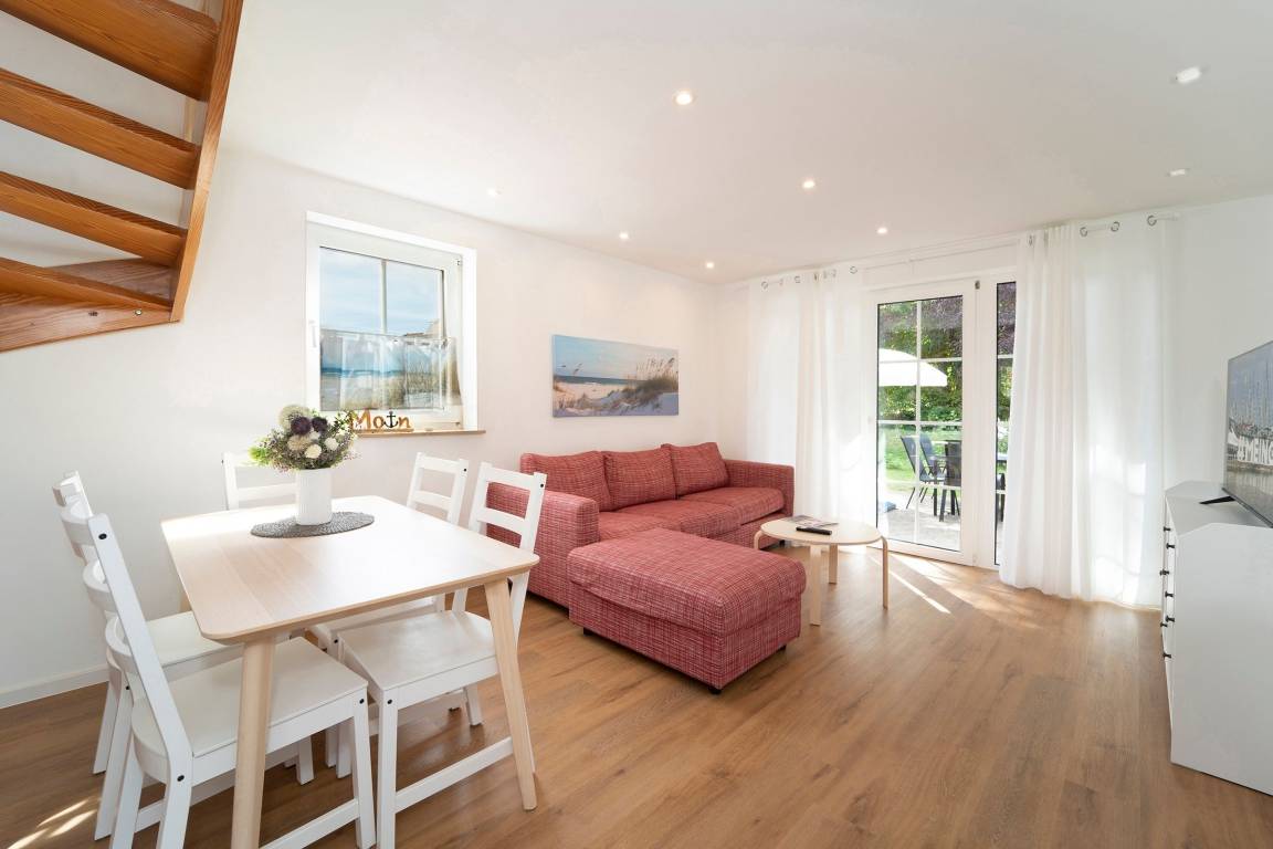 Der Wohn-/Essbereich mit offener Küche lädt zum gemeinsamen Essen, Fernsehen und erholsamen Urlaubsstunden ein. In der offenen voll ausgestatteten Küche finden Sie alles, um sich und Ihre Lieben kulinarisch zu verwöhnen. Vom Wohnbereich gelangen Sie auf die Terrasse mit Gartenmöbel, der perfekte Ort, um einen ereignisreichen Urlaubstag bei einem Glas Wein ausklingen zu lassen. Das angrenzende Gartenstück wird gemeinschaftlich von allen Bewohnern der Anlage genutzt. Drei Schlafzimmer und zwei moderne Bäder, befinden sich in der 1. Etage. Zwei Schlafzimmer sind jeweils mit einem Doppelbett (2x 90x200 cm) und Kleiderschrank ausgestattet. Das dritte Schlafzimmer verfügt über ein Einzelbett (90x200 cm). Die modernen und hell gefliesten Badezimmer, wovon eins mit einer Sauna ausgestattet ist, runden diese Ferienwohnung mit Dusche (Schwelle nur 2cm) und Fußbodenheizung ab.