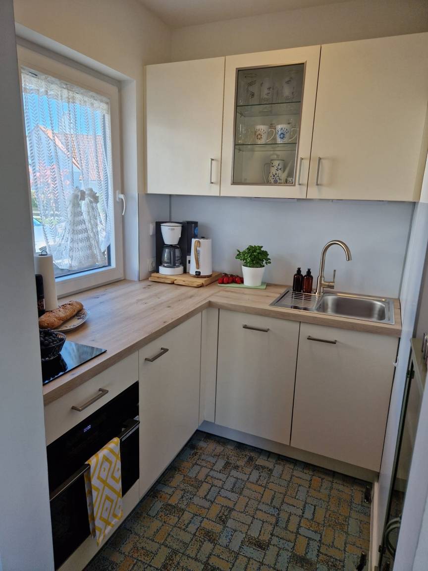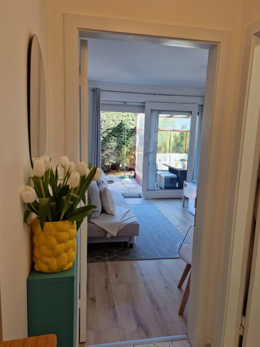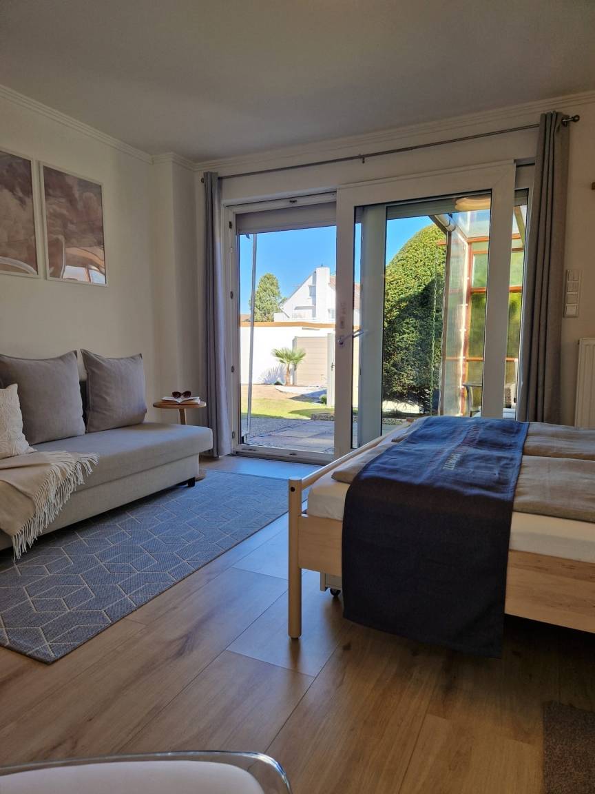 Die stilvoll eingerichtete 1-Zimmer-Ferienwohnung befindet sich im Erdgeschoss und bietet Platz für max. 3 Personen. Die Wohnfläche der ca. 26 m² großen Unterkunft verteilt sich auf ein Wohn-/Schlafzimmer sowie auf eine separate Küche, dem Badezimmer und einem Flur. Das Wohn- / Schlafzimmer ist mit einem Doppelbett 160 x 200 cm und einem gemütlichen Sofa ausgestattet, das man auch zum Bett ausziehen kann (Schlafgröße 140 x 190 cm) , auch ein Kleiderschrank und der Esstisch finden hier Platz. Vom Hauptraum aus, gelangt man auch in den traumhaften und geschmackvoll gestalteten Garten (280 m²), dem Bereich zum Relaxen und der Überdachten Terrasse (7 m²) mit gemütlichen Loungemöbeln. Die separate Küche ist u.a. mit 2 Kochfeldern, Backofen, Kühlschrank, Gefrierfach, Mikrowelle, Toaster und Kaffeemaschine ausgestattet.