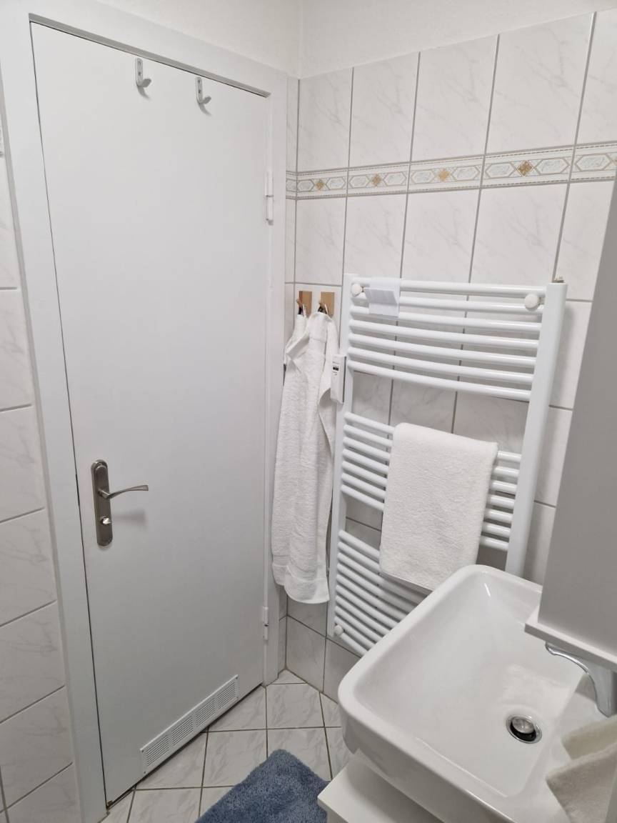 Die Fenster sind mit Vorhängen und elektrischen Aussenrollos abzudunkeln. Das Badezimmer verfügt über Dusche, Waschbecken und WC.