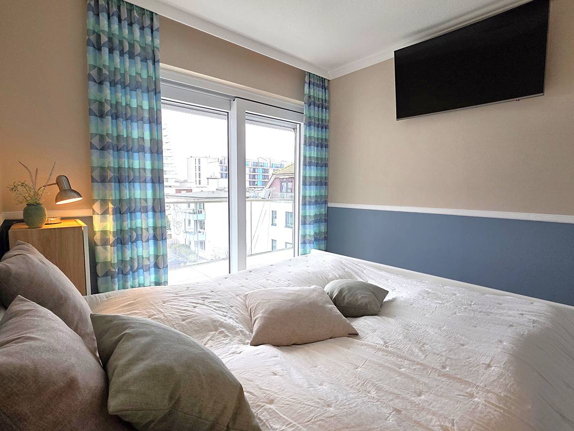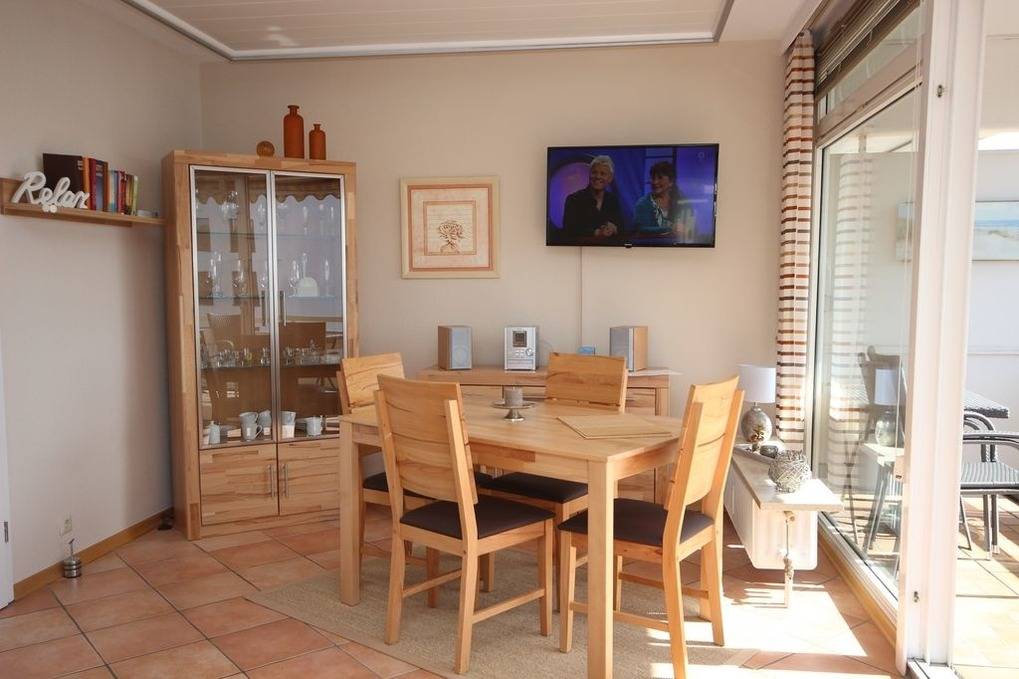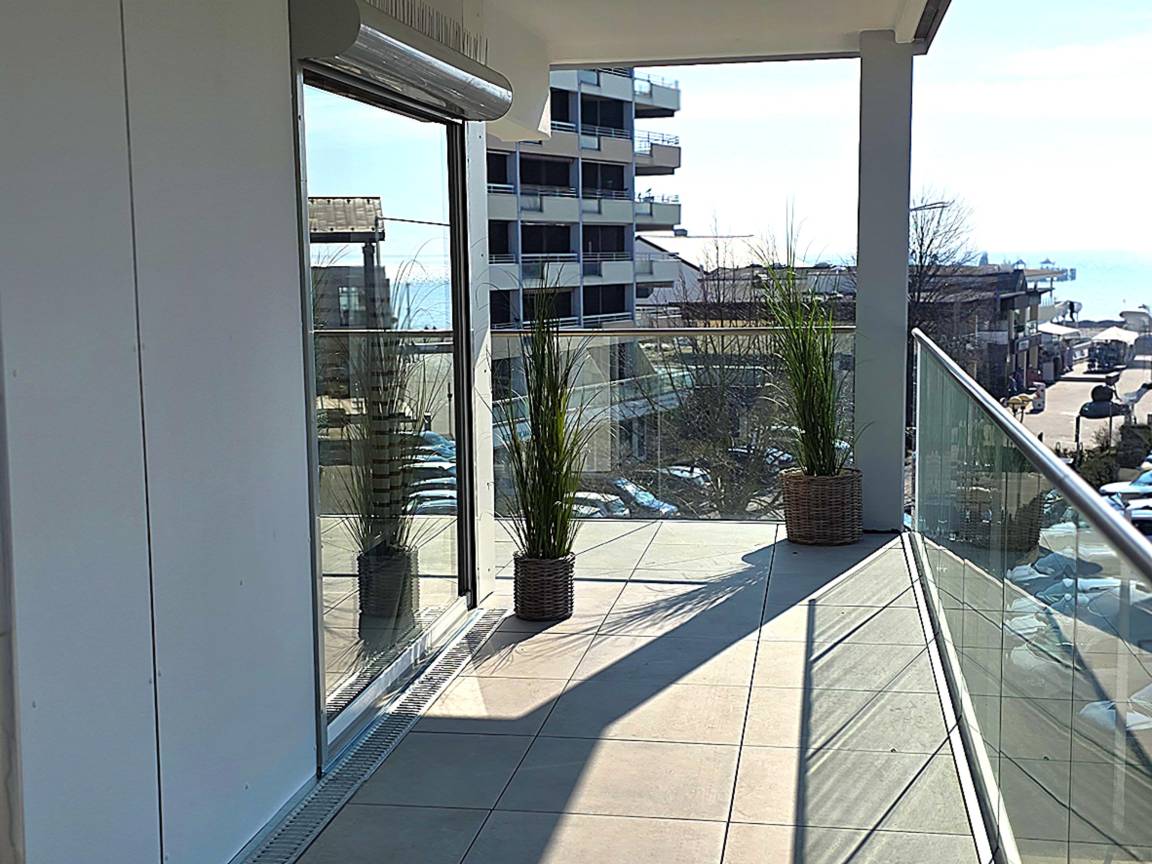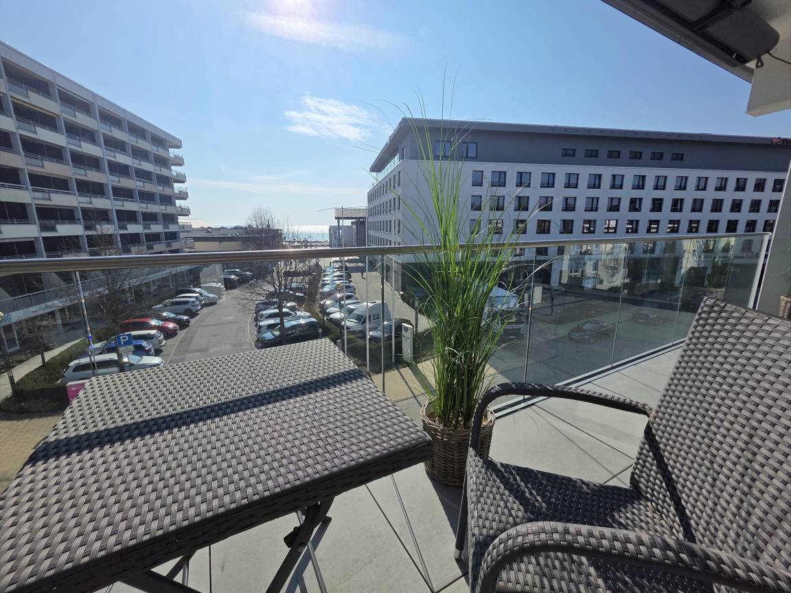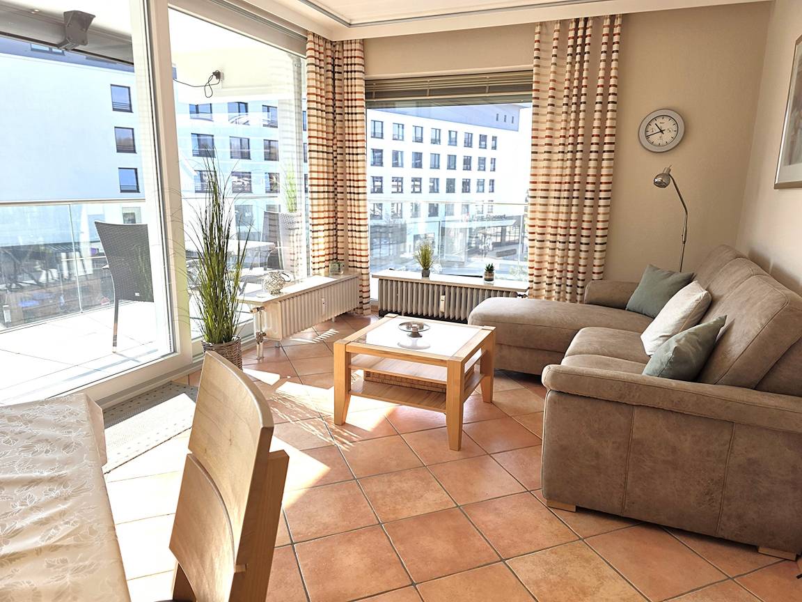 Das geräumige Wohnzimmer ist möbliert mit Couchgarnitur, Esstisch, TV, Radio und hat Zugang zur möblierten Balkon mit Markise und Ostseeblick. WLAN