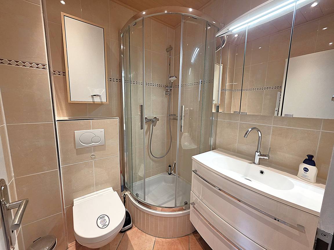 Modernes, gefliestes Bad mit Rundglasdusche, Waschbecken und WC.