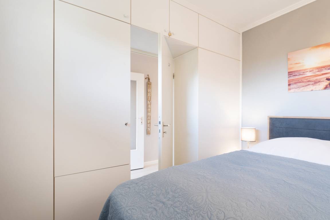 Schlafzimmer: 1 Doppelboxspringbett (2x 80x200 cm, durchgehender Topper), Kleiderschrank, TV, Verdunkelung: Plissee und Vorhang, Platz für ein Babybett