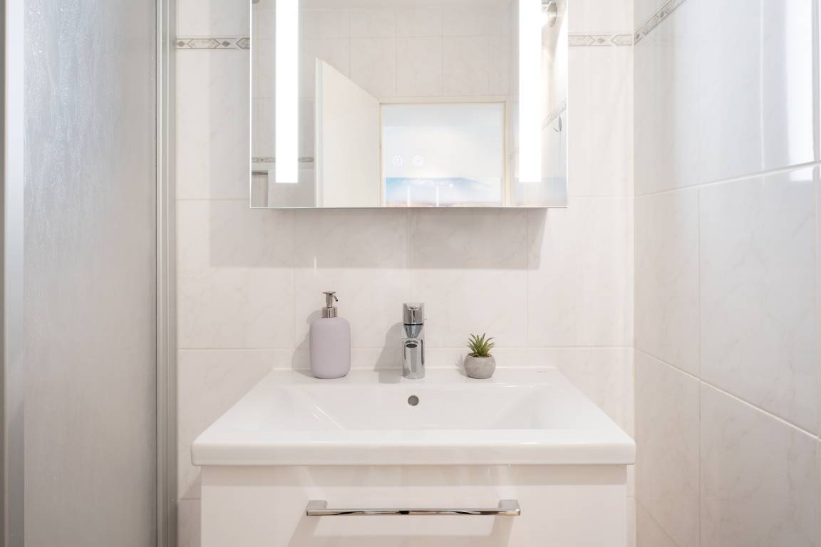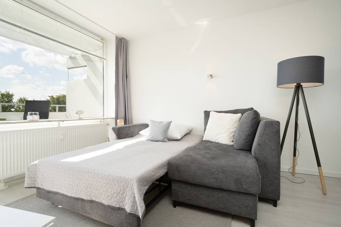 Im separaten Schlafzimmer erwartet Sie ein komfortables Doppelbett, während im Wohnbereich ein Schlafsofa für einen weiteren Gast bereitsteht. Das Bad ist funktional mit Dusche, WC und Handtuchwärmer ausgestattet.