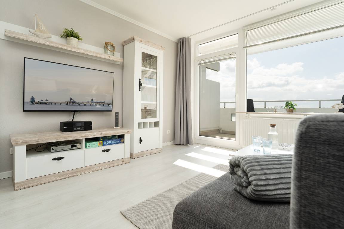 Diese charmante Ferienwohnung im 3. Stock eines gepflegten Hauses begrüßt Sie mit einem hellen Wohnbereich, ausgestattet mit TV, DVD- und CD-Player und gemütlicher Sitzecke – ideal zum Entspannen nach einem erlebnisreichen Strandtag. Vom angrenzenden Balkon mit Gartenmöbeln genießen Sie die frische Ostseeluft und den Blick auf die Ostsee.