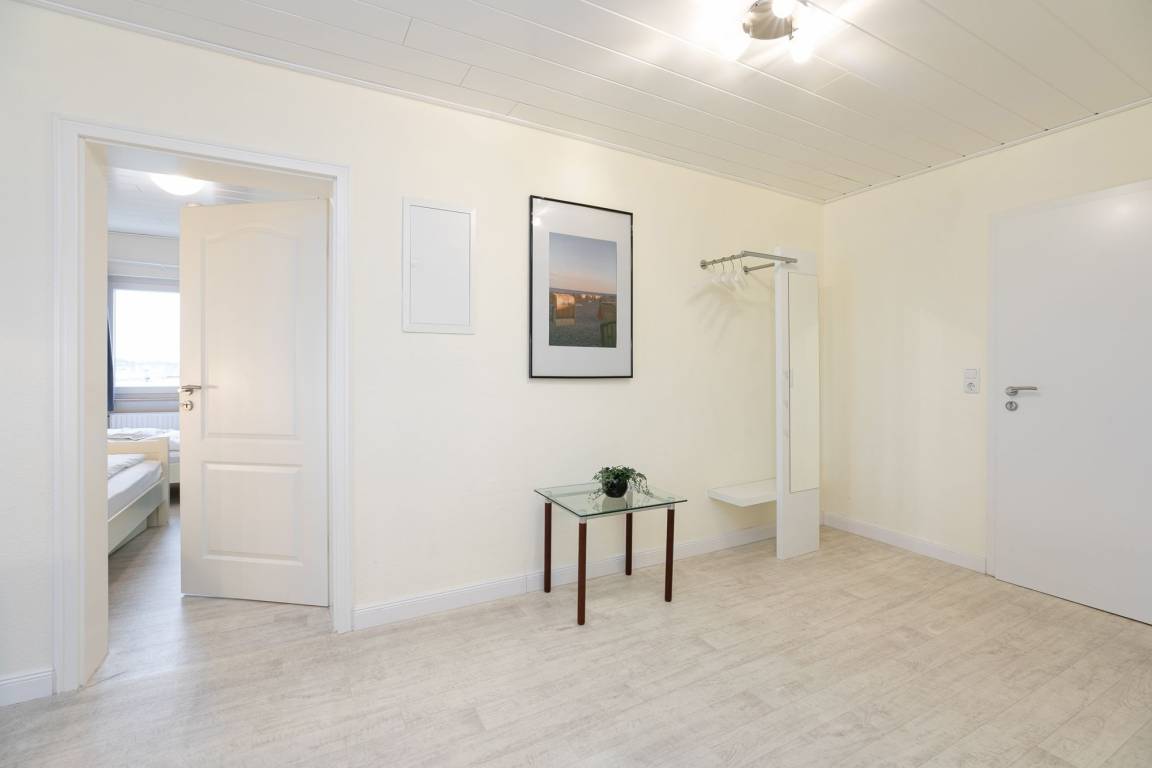 Vom Flur gelangen Sie in alle Räume. Zu Ihrer Linken liegen das Badezimmer mit Dusche und extra großem Waschbecken, die helle und voll ausgestattete Küche und das erste Schlafzimmer mit Doppelbett (2x 90x200 cm). Zu Ihrer Rechten befinden sich zuerst das Kinderzimmer mit 2 Einzelbetten (je 90x200 cm) und dahinter das Masterschlafzimmer mit Doppelbett (2x 90x200 cm). Von hier haben Sie Zutritt zum Balkon mit einmaligem Blick auf die Ostsee, spätestens hier vergessen Sie alle Sorgen. Der offen gestaltete Wohnraum ebenfalls mit traumhafter Aussicht auf die Promenade und den Strand, lädt mit einer warmen Atmosphäre zum Erholen uns Wohlfühlen ein.