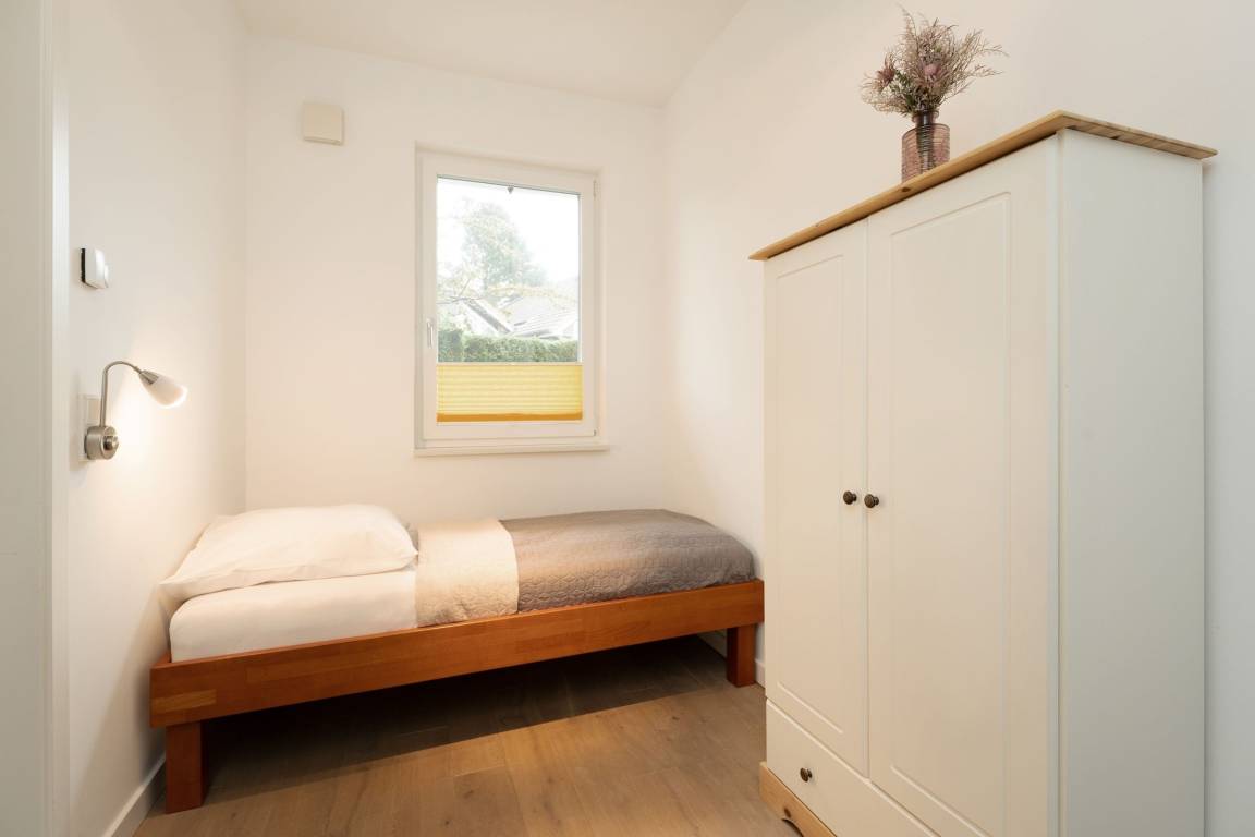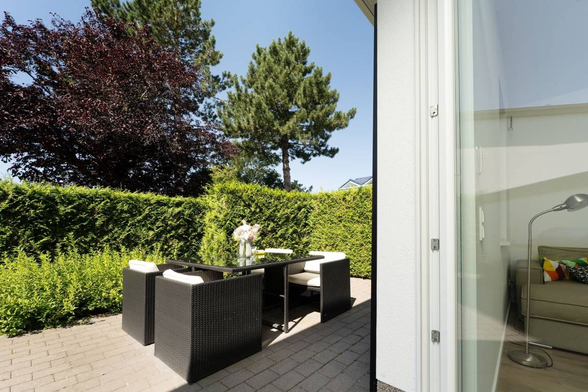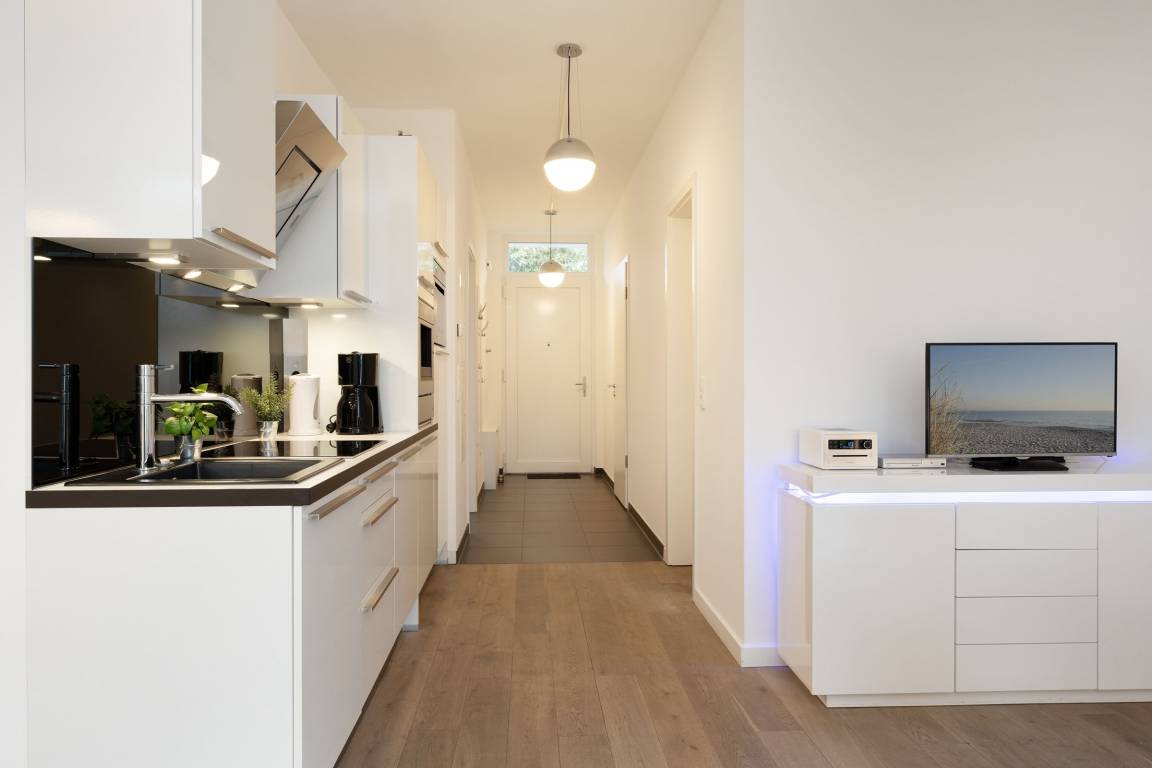Alles ausgeräumt und verstaut? Dann wird es Zeit für einen frisch gebrühten Kaffee! Die in Wohn- und Essraum integrierte hochwertige Küchenzeile ist in weißem Hochglanz gehalten und verfügt über ein 4-er Ceranfeld, Backofen, Spülmaschine und einem eingebauten Kaffeeautomaten. Vom Wohnzimmer gelangen Sie direkt auf Ihre möblierte ruhig gelegene Terrasse Richtung Westen mit Markise. Vom Flur aus sind beide Schlafzimmer erreichbar: eines mit Doppelbett (2x90x200cm) und großem Kleiderschrank sowie Zugang zum Bad mit ebenerdiger Dusche, ein weiterer separater Schlafraum mit Einzelbett (90x200 cm) und einer Schlafcouch (ca. 120x195 cm). Vom Flur zugänglich befindet sich ein weiteres Duschbad. Alle Fenster sind mit Plissee-Jalousien und zusätzlich mit dunklen Fensterläden versehen. Ein Waschtrockner sowie kostenfreies WLAN stehen Ihnen ebenfalls zur Verfügung.