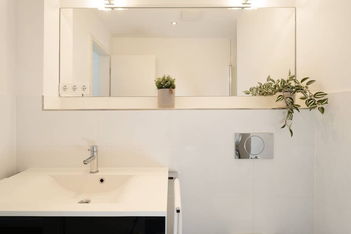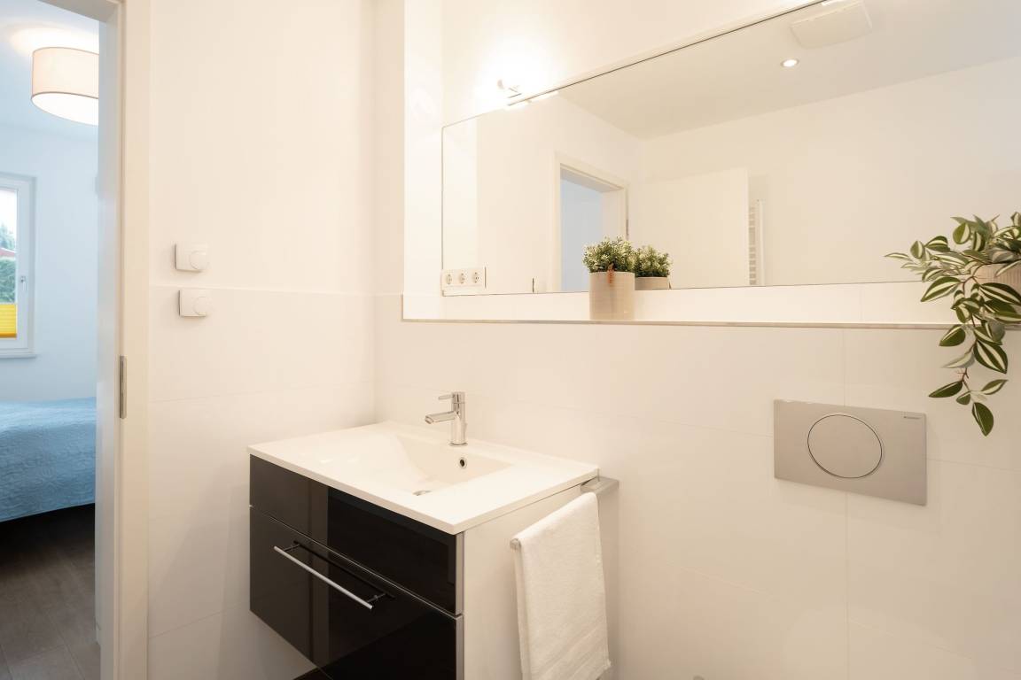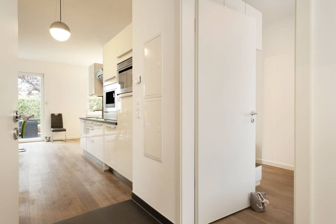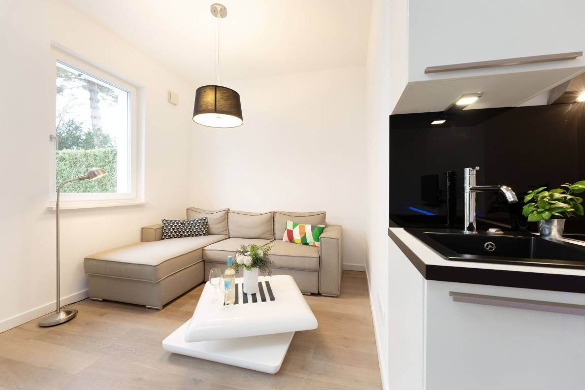 Alles ausgeräumt und verstaut? Dann wird es Zeit für einen frisch gebrühten Kaffee! Die in Wohn- und Essraum integrierte hochwertige Küchenzeile ist in weißem Hochglanz gehalten und verfügt über ein 4-er Ceranfeld, Backofen, Spülmaschine und einem eingebauten Kaffeeautomaten. Vom Wohnzimmer gelangen Sie direkt auf Ihre möblierte ruhig gelegene Terrasse Richtung Westen mit Markise. Vom Flur aus sind beide Schlafzimmer erreichbar: eines mit Doppelbett (2x90x200cm) und großem Kleiderschrank sowie Zugang zum Bad mit ebenerdiger Dusche, ein weiterer separater Schlafraum mit Einzelbett (90x200 cm) und einer Schlafcouch (ca. 120x195 cm). Vom Flur zugänglich befindet sich ein weiteres Duschbad. Alle Fenster sind mit Plissee-Jalousien und zusätzlich mit dunklen Fensterläden versehen. Ein Waschtrockner sowie kostenfreies WLAN stehen Ihnen ebenfalls zur Verfügung.